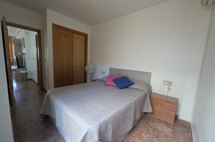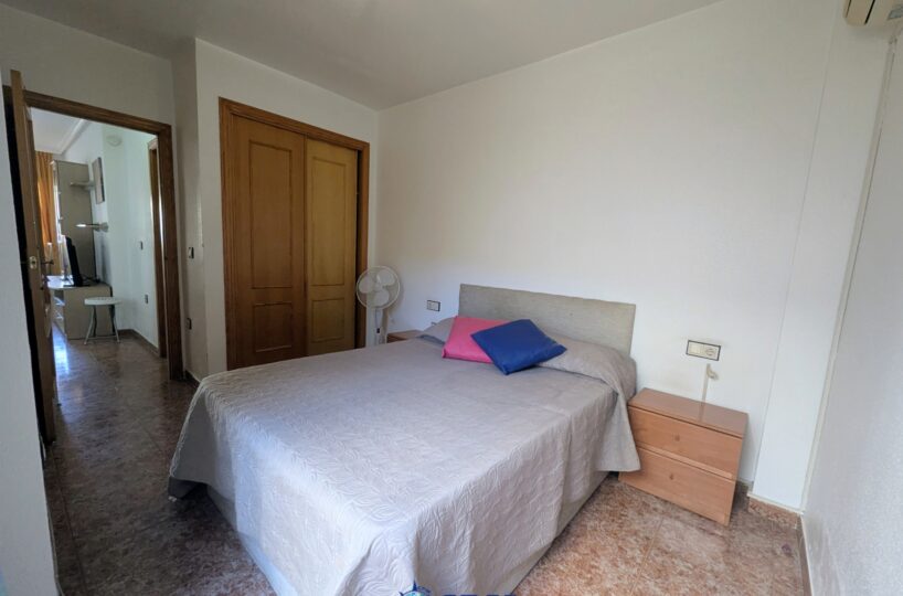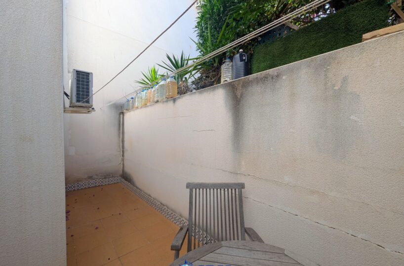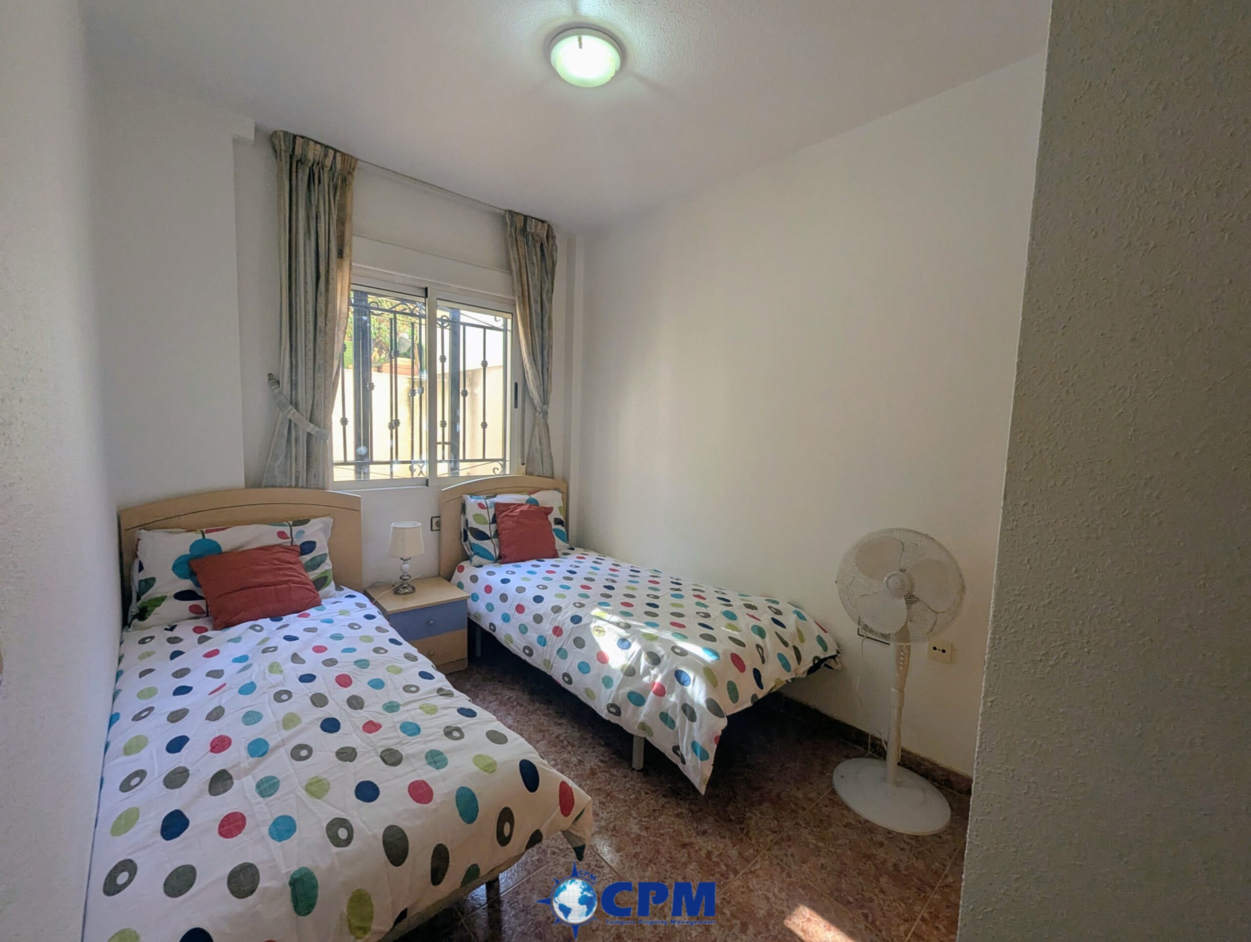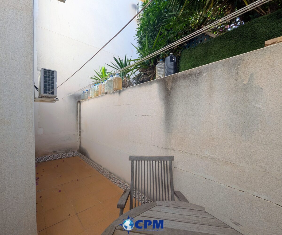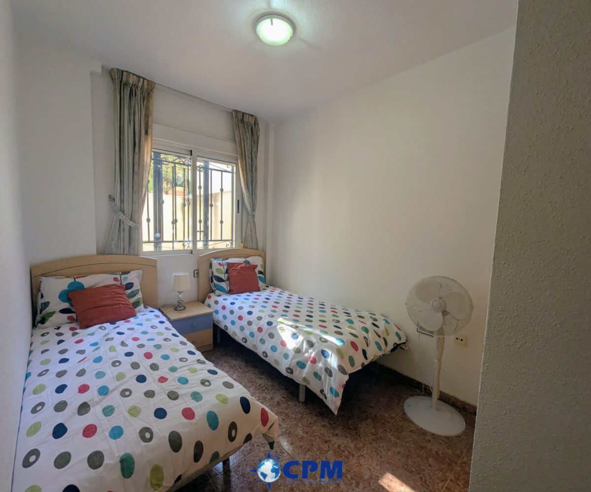 Hay dos dormitorios, uno principal y otro con dos camas individuales, ambos con armarios empotrados. El dormitorio principal tiene acceso directo a una terraza privada en la parte trasera, lo que ofrece un espacio exterior adicional.