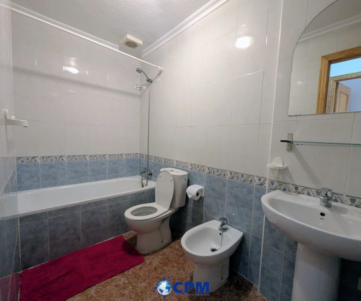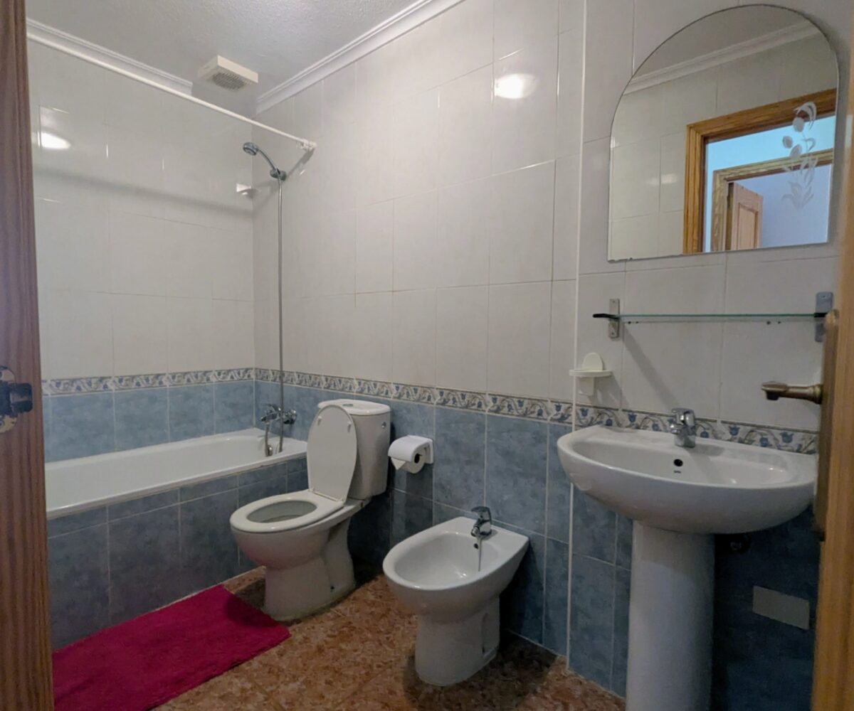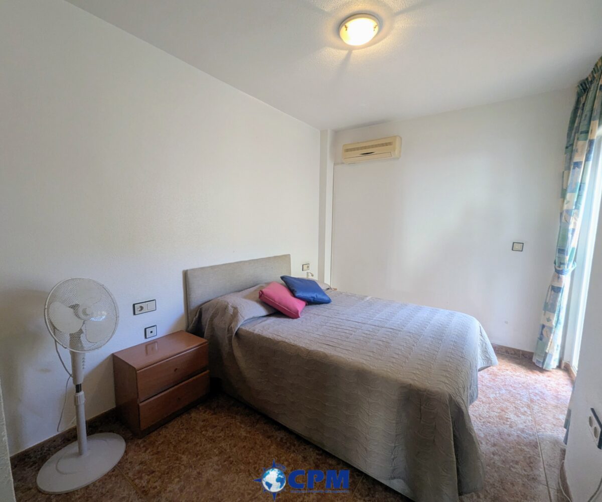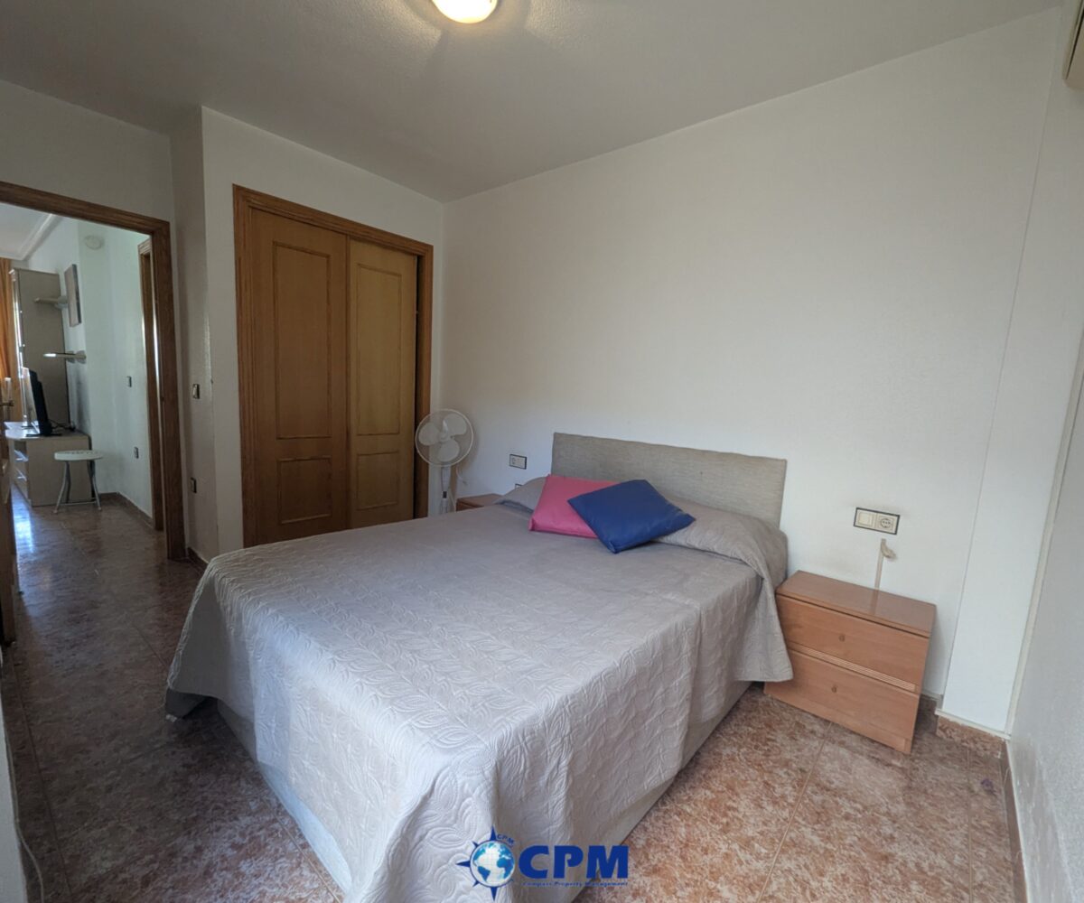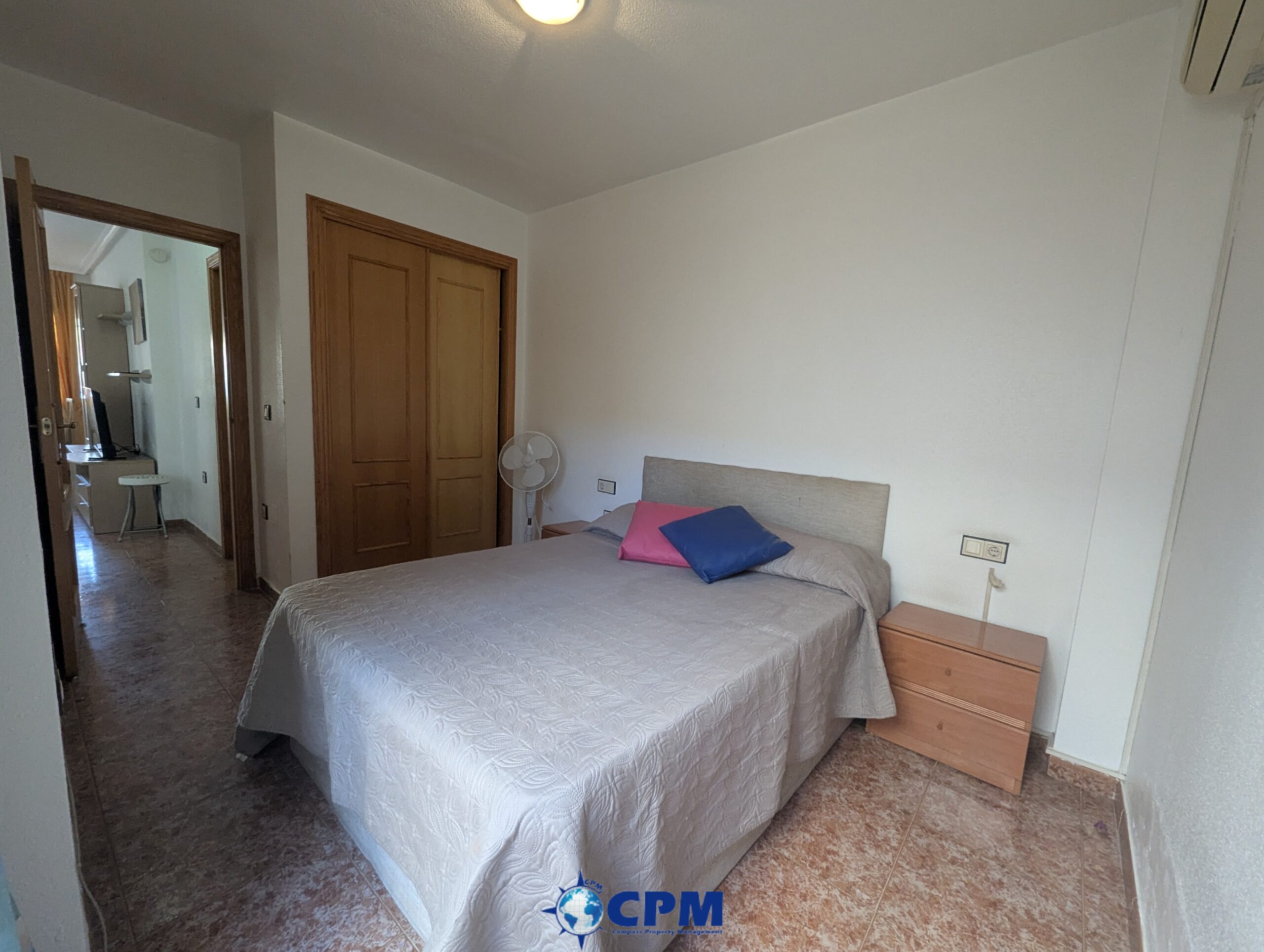 Hay dos dormitorios, uno principal y otro con dos camas individuales, ambos con armarios empotrados. El dormitorio principal tiene acceso directo a una terraza privada en la parte trasera, lo que ofrece un espacio exterior adicional.