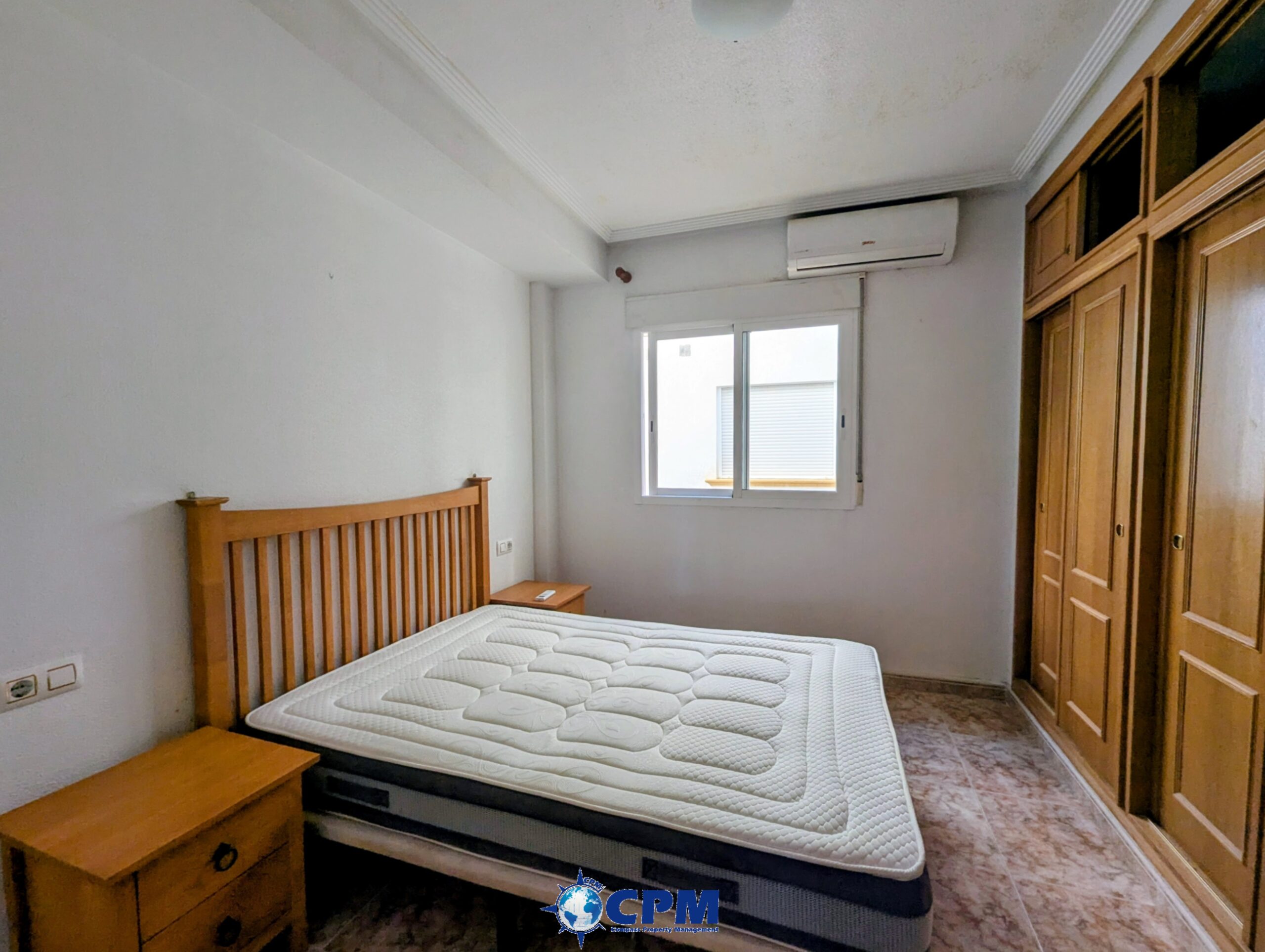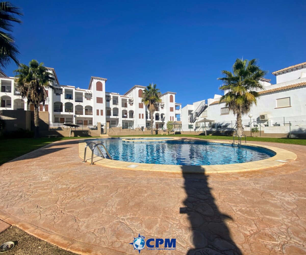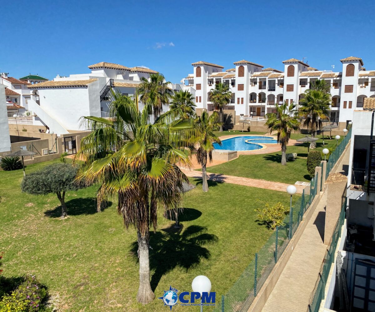 The apartment offers two bedrooms and one family bathroom, and also benefits from access to a well-maintained communal swimming pool.