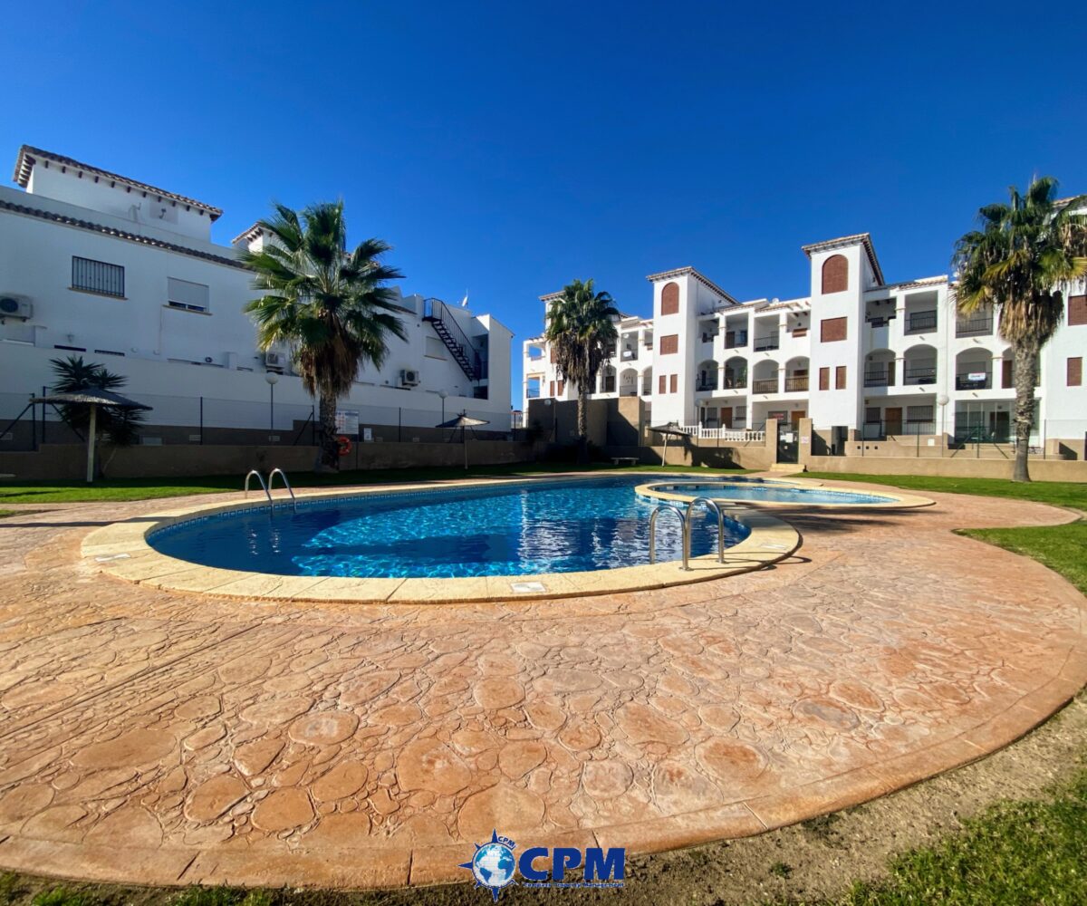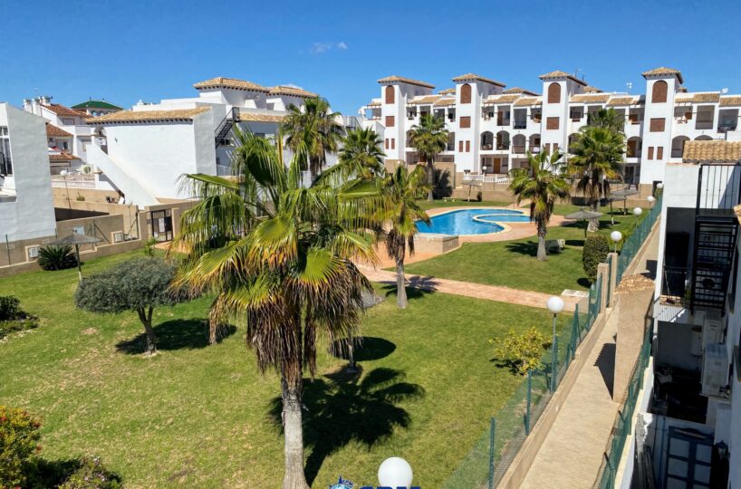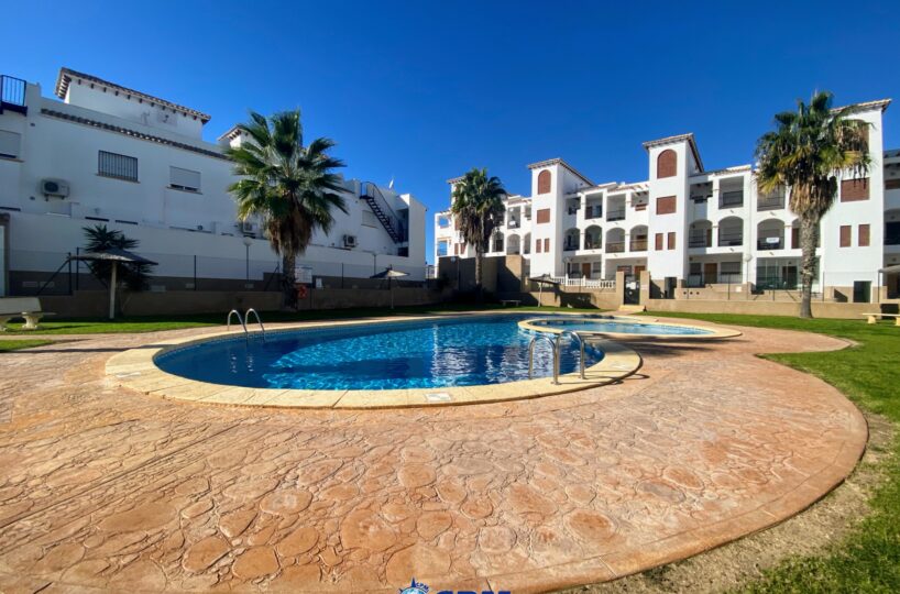 El apartamento cuenta con dos dormitorios, un baño familiar y acceso a una piscina comunitaria bien cuidada.