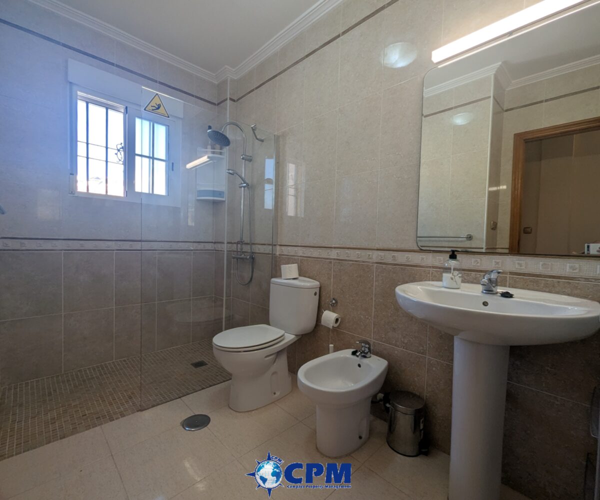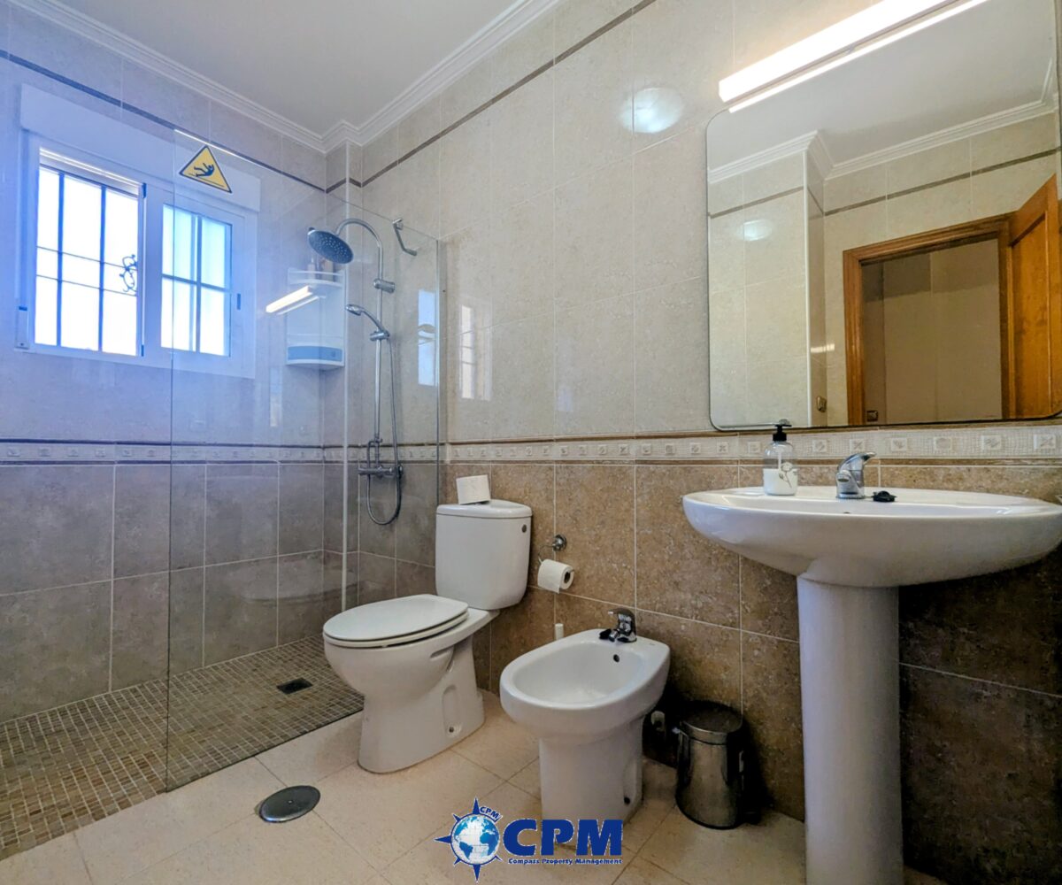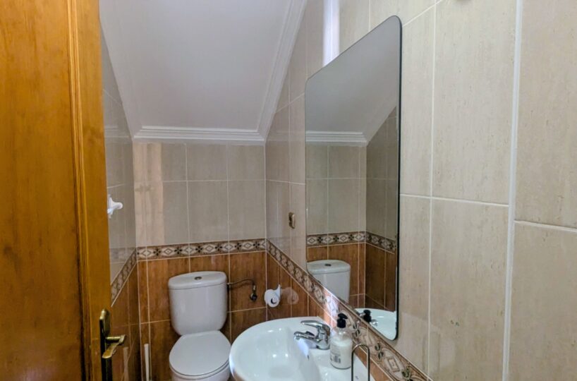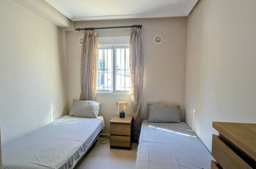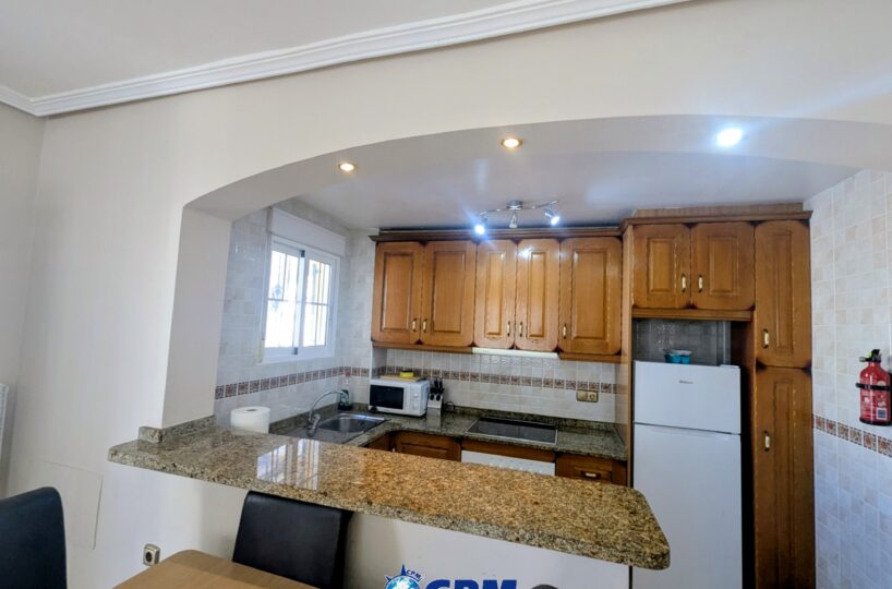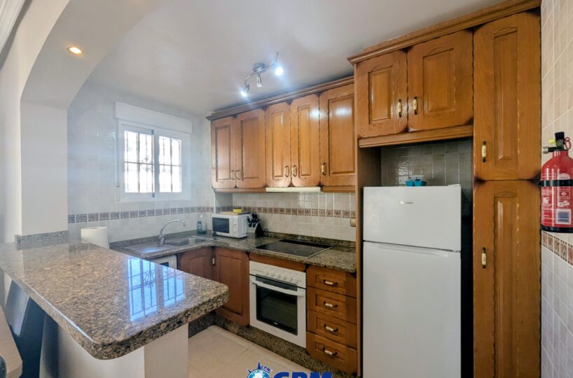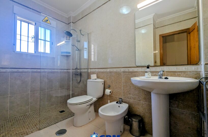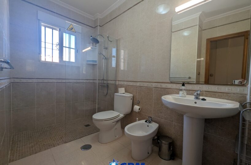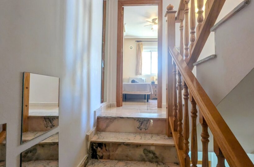 La vivienda cuenta con un amplio jardín delantero y una terraza privada, perfectos para disfrutar del clima mediterráneo. Al acceder a la propiedad encontramos un luminoso salón-comedor con cocina de concepto abierto, todo en el mismo nivel. En la planta baja también dispone de un dormitorio doble y un baño con ducha, muy práctico para invitados o para vivir en una sola planta.