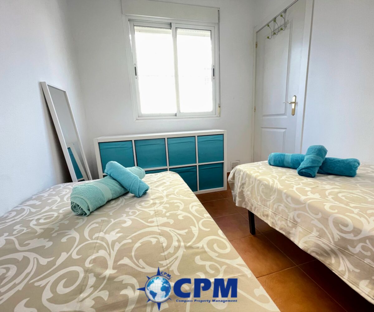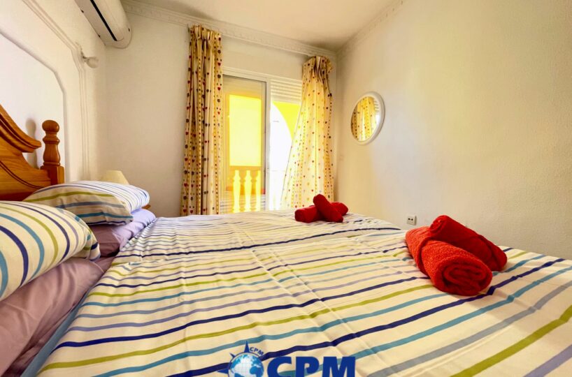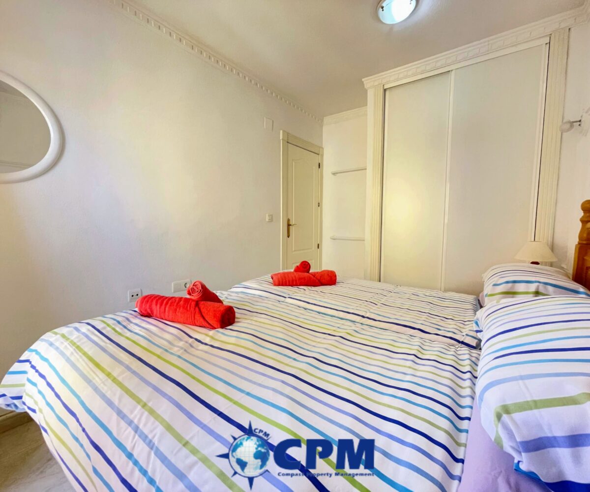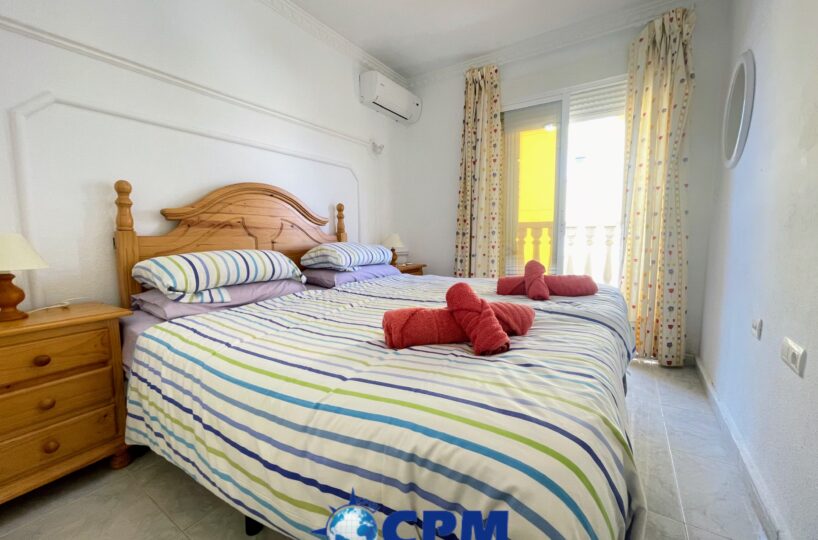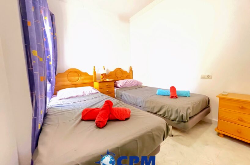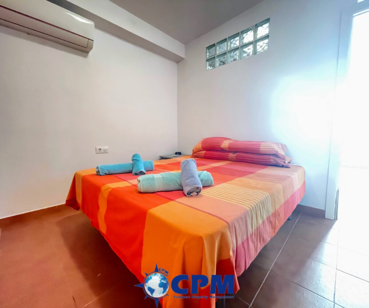 The lower level houses two bedrooms, ideal for family or guests, complemented by a family bathroom. The downstairs master bedroom features a double bed and built-in wardrobes, and both rooms benefit from air conditioning for comfort during the warmer months. The second bedroom is fitted with twin single beds, perfect for children or visitors. From the lower level, you can step out to a terrace that leads directly to the communal area, creating a seamless transition to outdoor living.