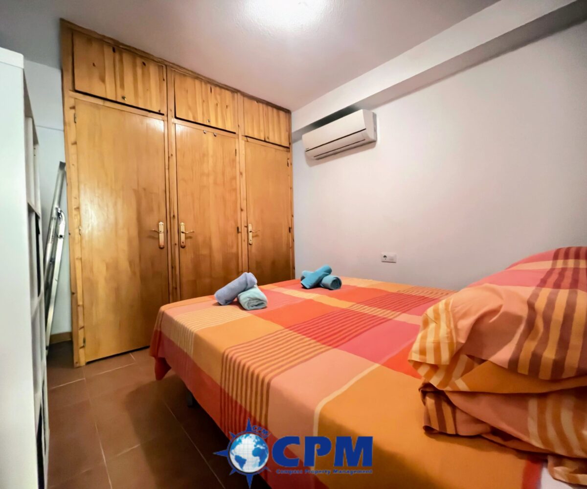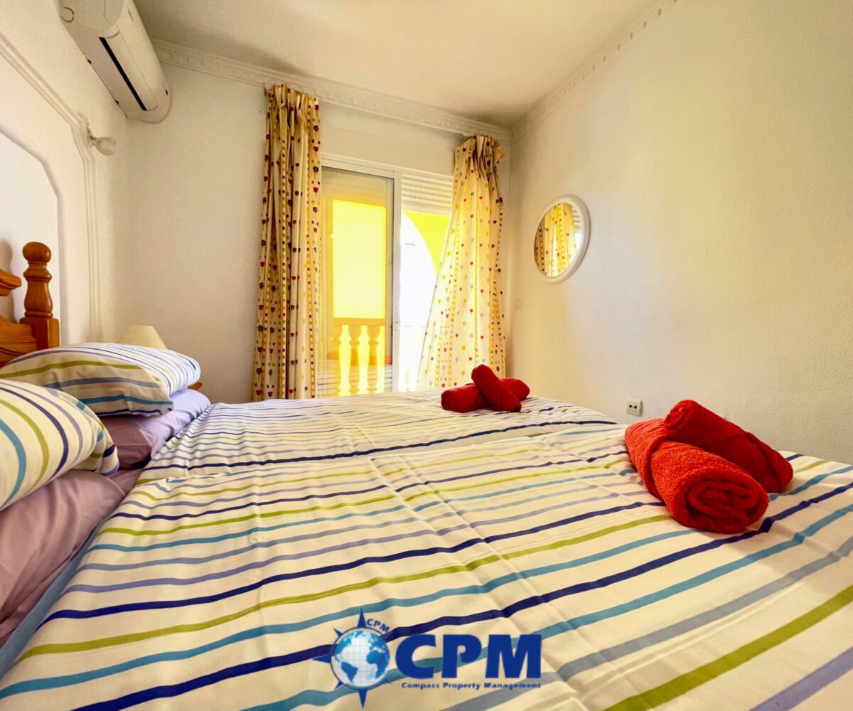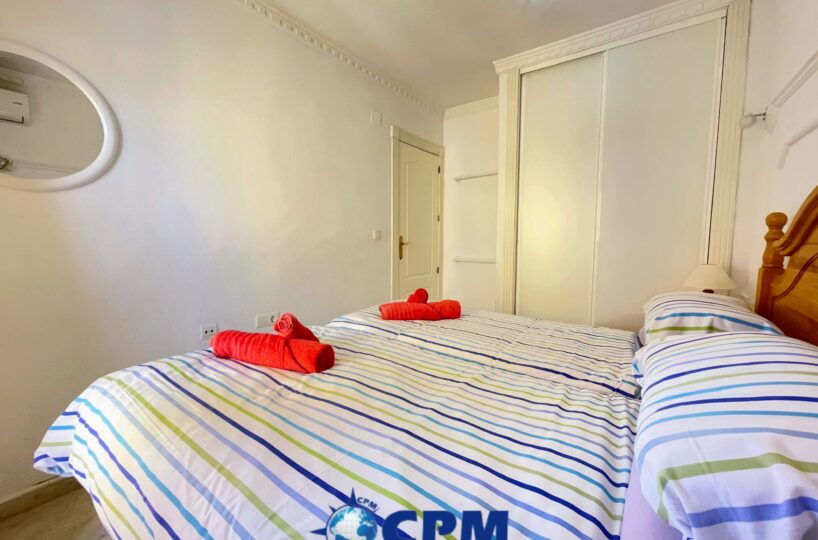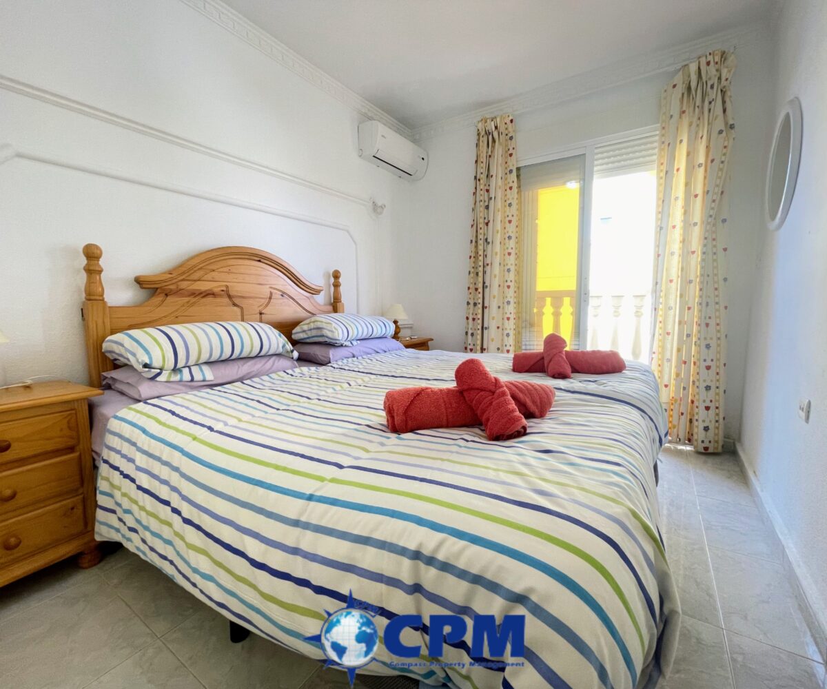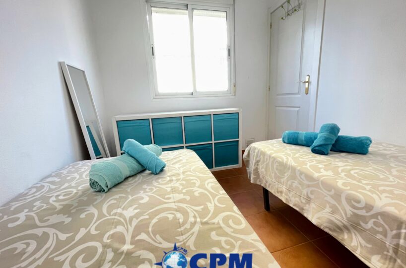 The lower level houses two bedrooms, ideal for family or guests, complemented by a family bathroom. The downstairs master bedroom features a double bed and built-in wardrobes, and both rooms benefit from air conditioning for comfort during the warmer months. The second bedroom is fitted with twin single beds, perfect for children or visitors. From the lower level, you can step out to a terrace that leads directly to the communal area, creating a seamless transition to outdoor living.