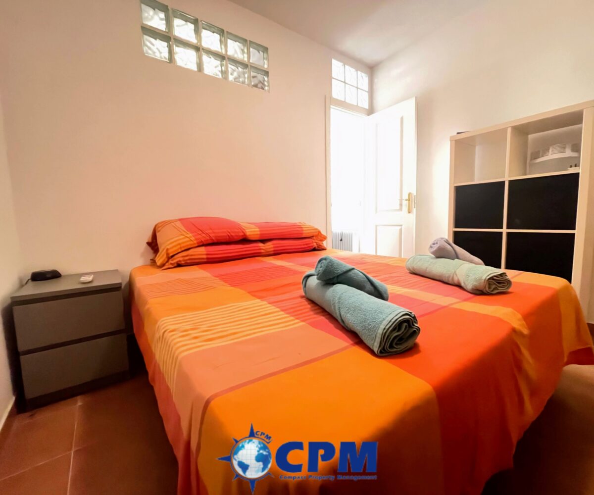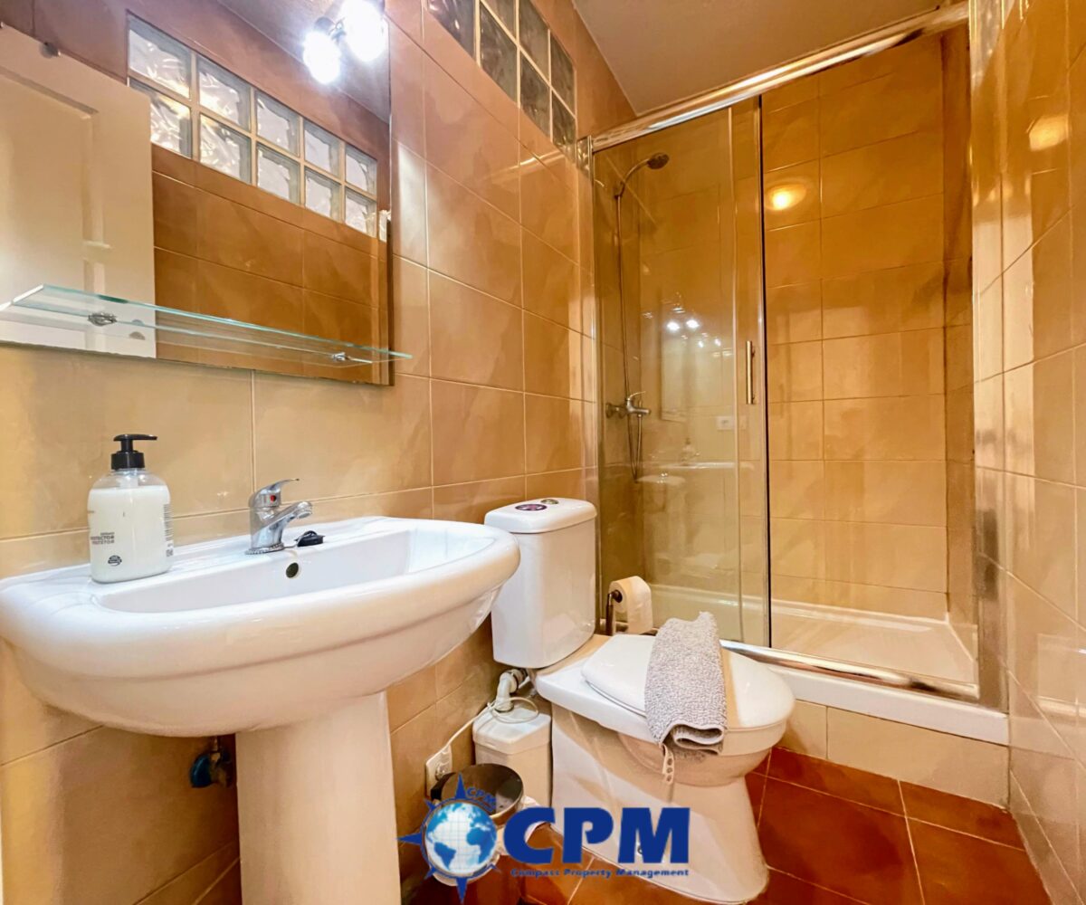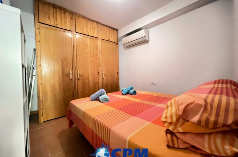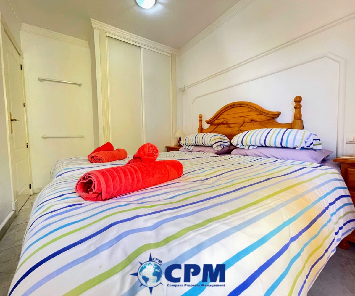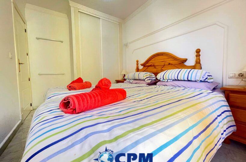 The lower level houses two bedrooms, ideal for family or guests, complemented by a family bathroom. The downstairs master bedroom features a double bed and built-in wardrobes, and both rooms benefit from air conditioning for comfort during the warmer months. The second bedroom is fitted with twin single beds, perfect for children or visitors. From the lower level, you can step out to a terrace that leads directly to the communal area, creating a seamless transition to outdoor living.