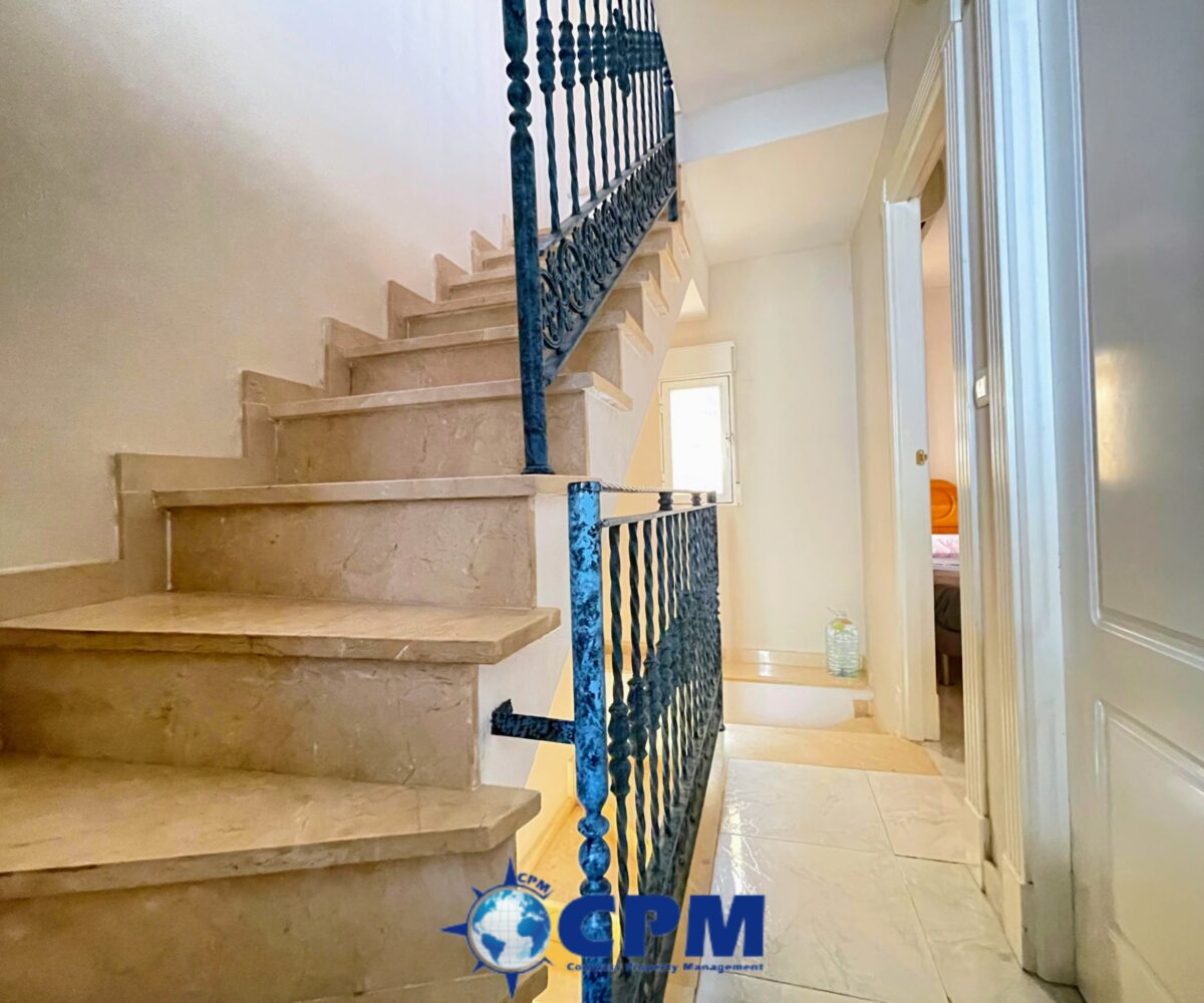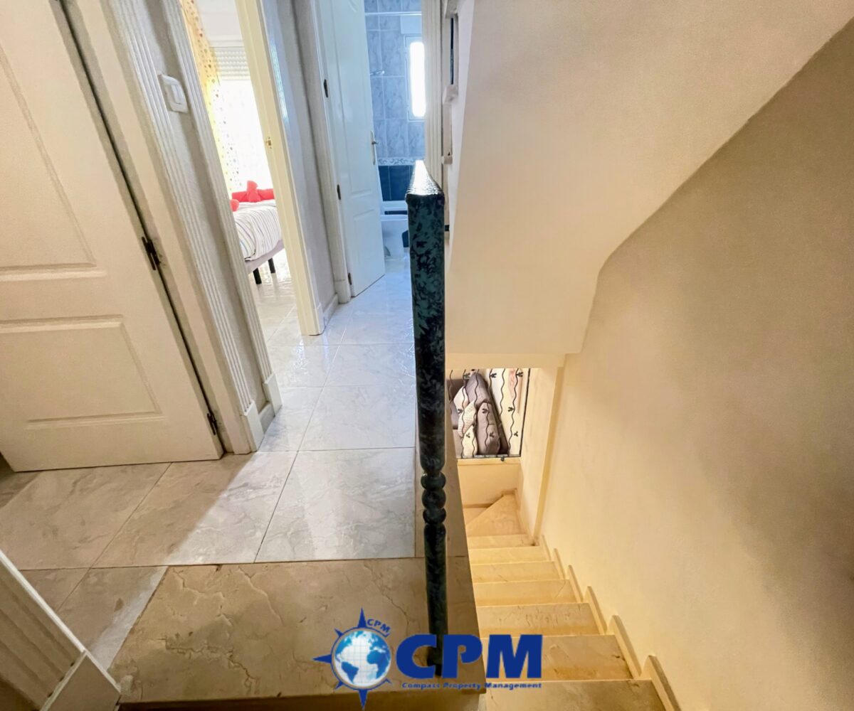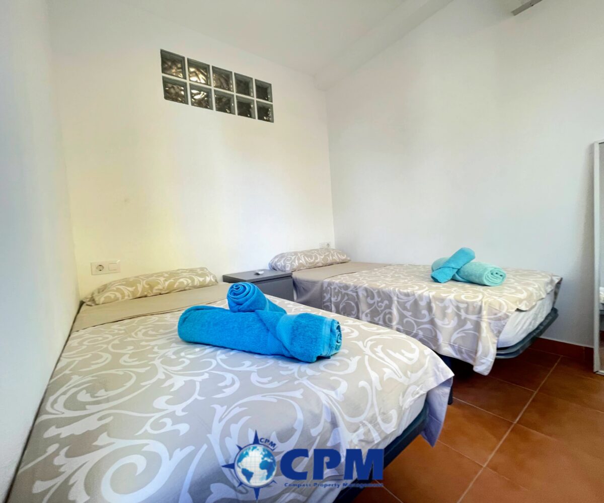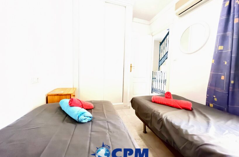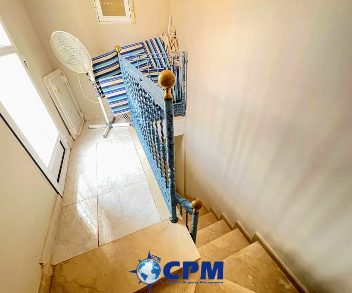 Ascend to the upper level where you’ll find two additional bedrooms, both equipped with air conditioning. At the top of the stairs, the first bedroom features twin single beds and a built-in wardrobe. The master bedroom on this floor consists of twin beds. The upper level also boasts a family bathroom with a bath, toilet, and bidet. Access to the spacious solarium is also available from this level, offering a perfect spot for sunbathing or entertaining under the sky.