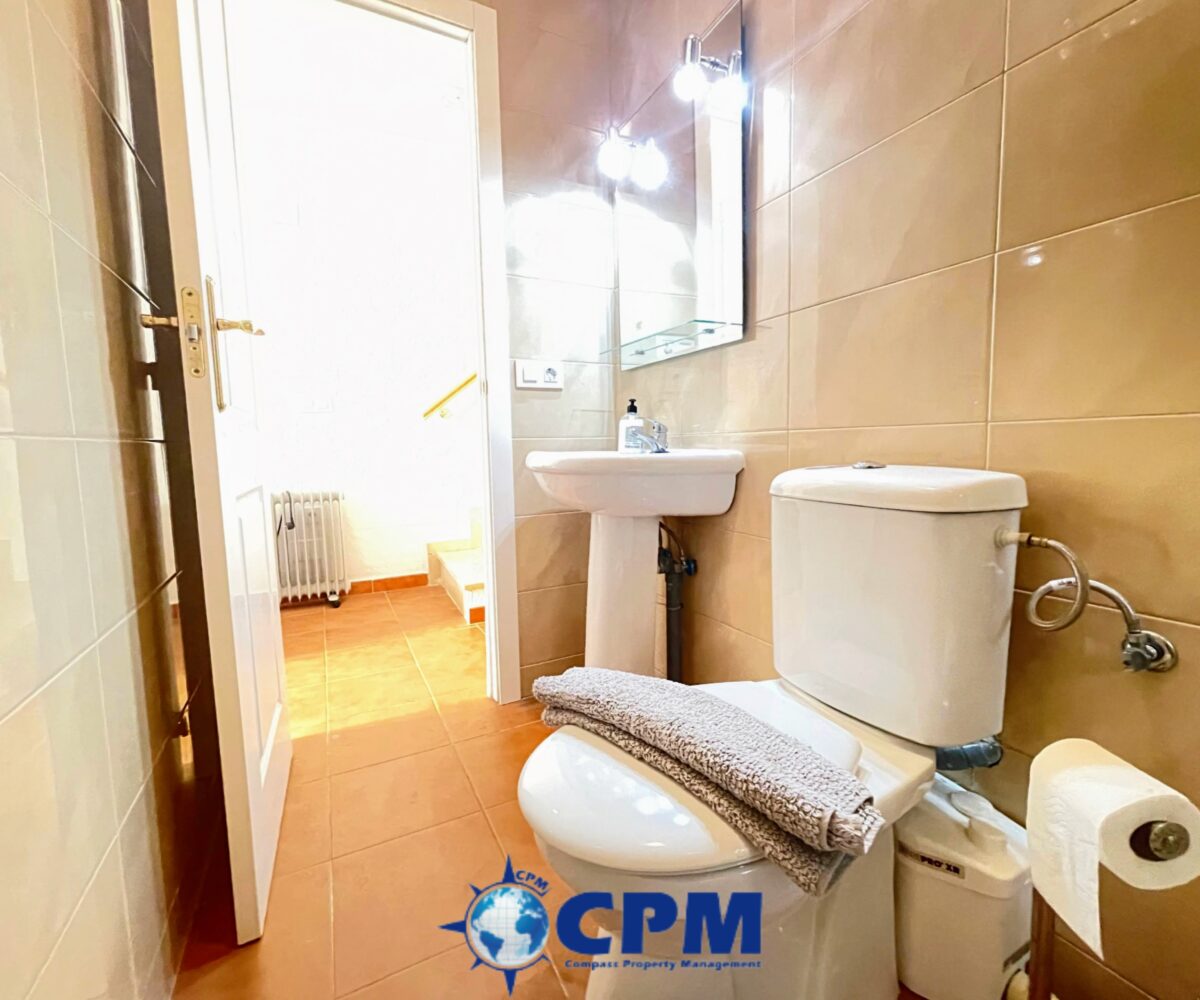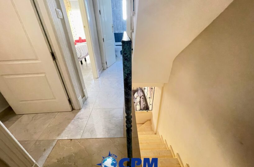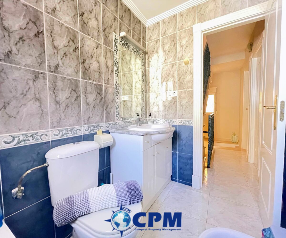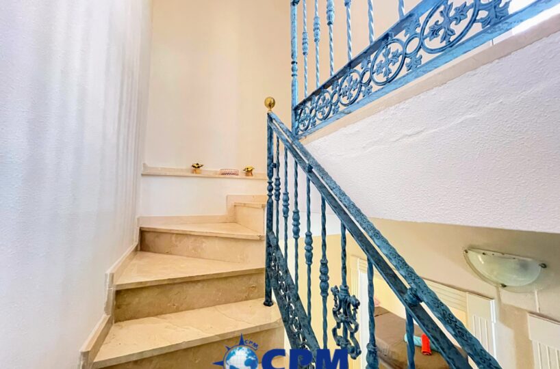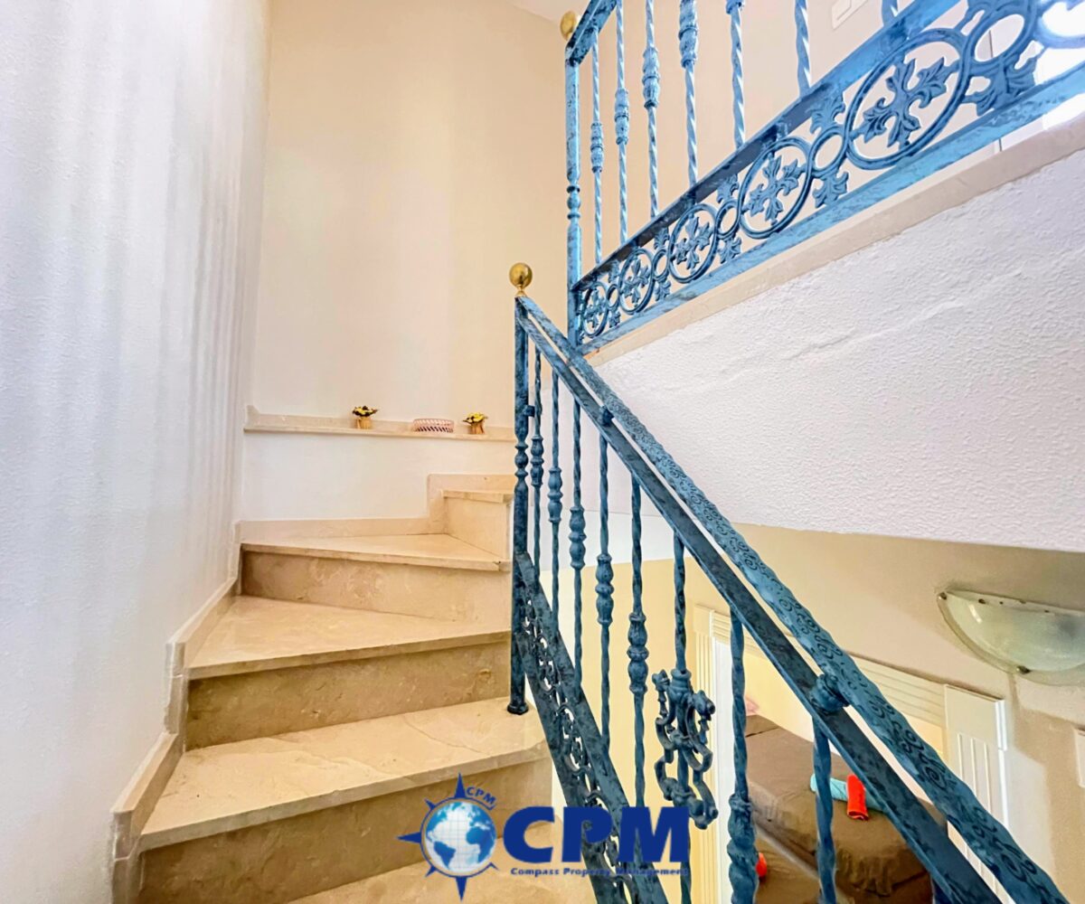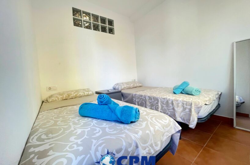 Ascend to the upper level where you’ll find two additional bedrooms, both equipped with air conditioning. At the top of the stairs, the first bedroom features twin single beds and a built-in wardrobe. The master bedroom on this floor consists of twin beds. The upper level also boasts a family bathroom with a bath, toilet, and bidet. Access to the spacious solarium is also available from this level, offering a perfect spot for sunbathing or entertaining under the sky.