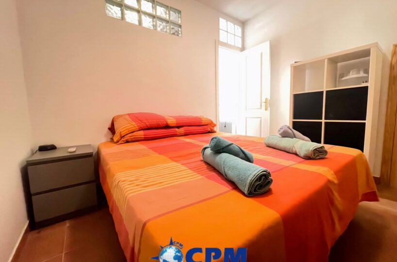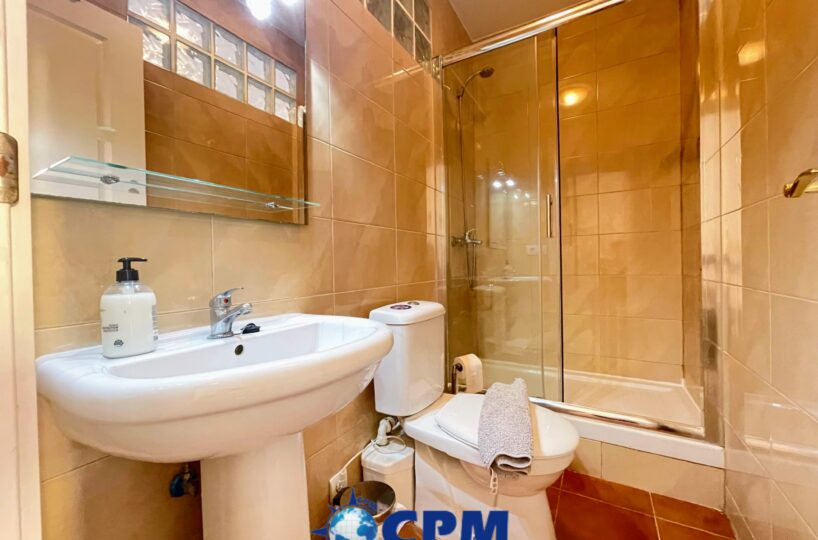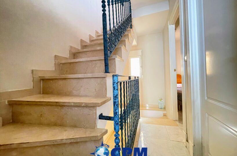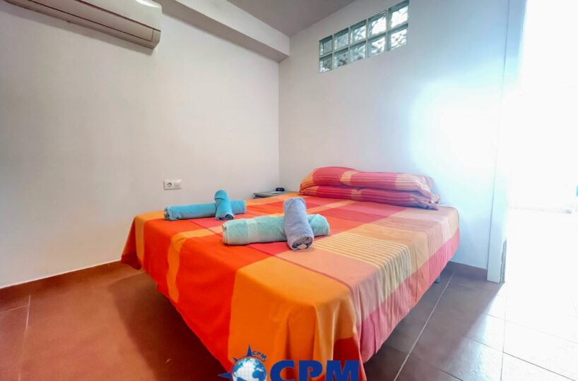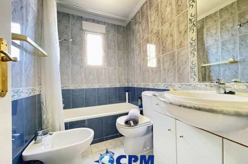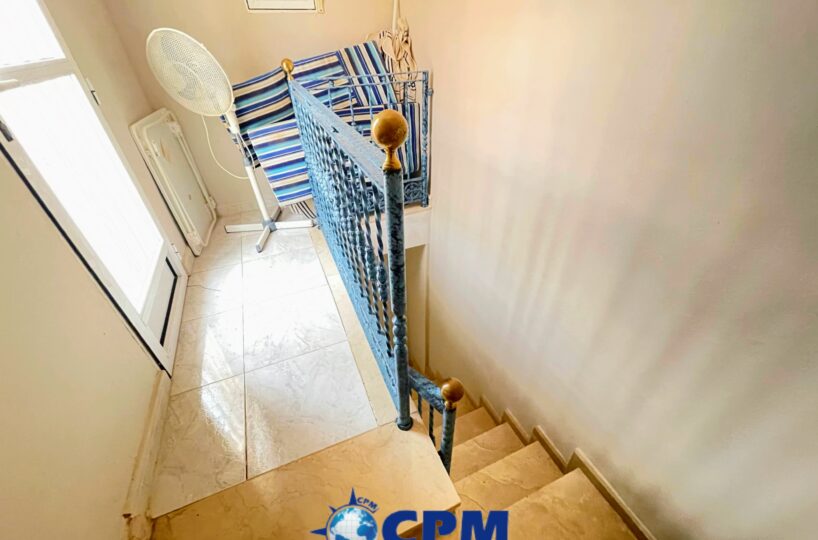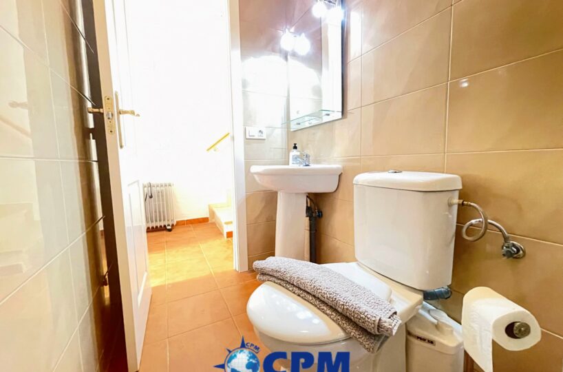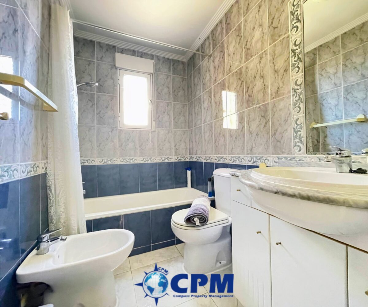 Ascend to the upper level where you’ll find two additional bedrooms, both equipped with air conditioning. At the top of the stairs, the first bedroom features twin single beds and a built-in wardrobe. The master bedroom on this floor consists of twin beds. The upper level also boasts a family bathroom with a bath, toilet, and bidet. Access to the spacious solarium is also available from this level, offering a perfect spot for sunbathing or entertaining under the sky.