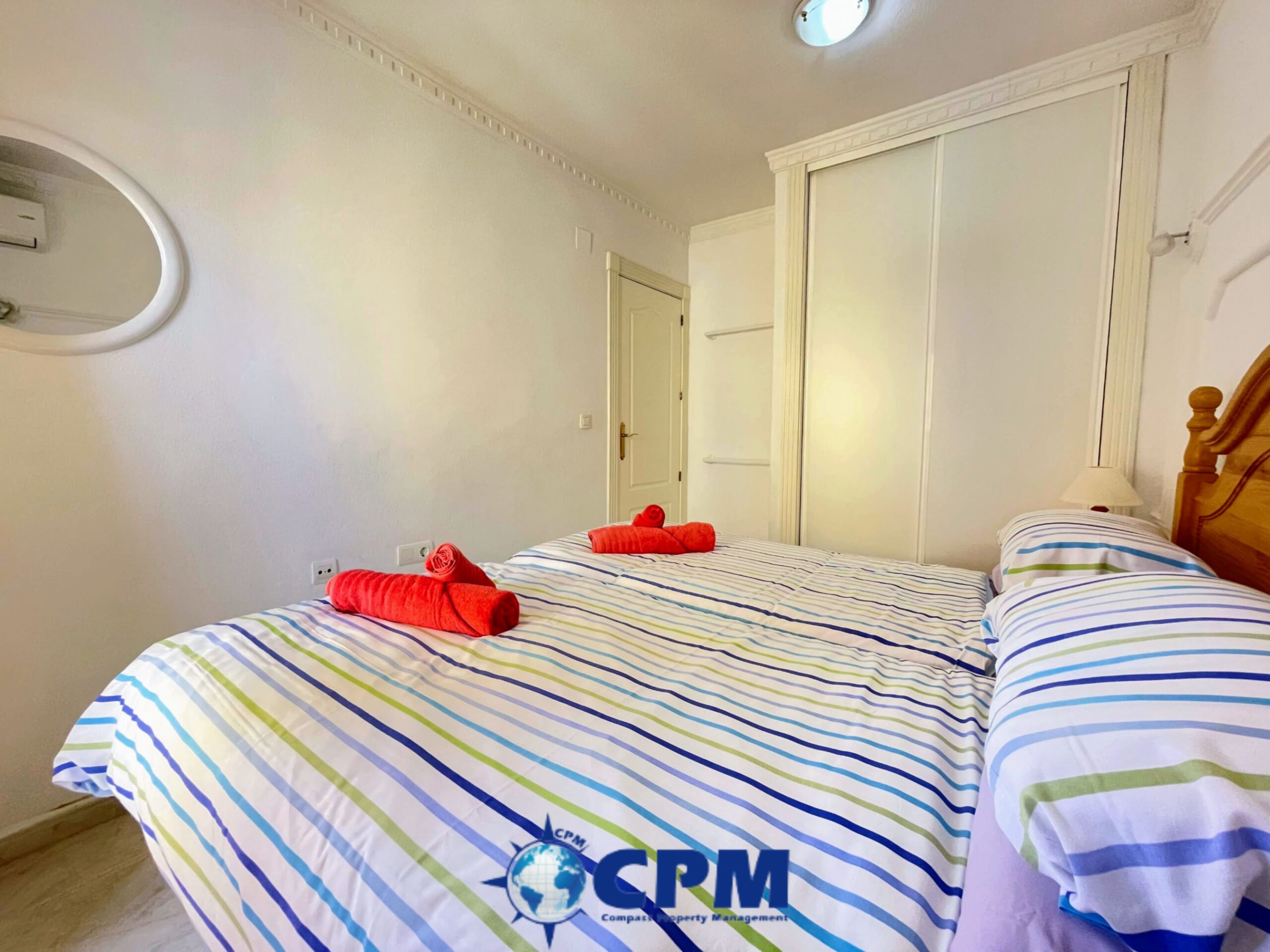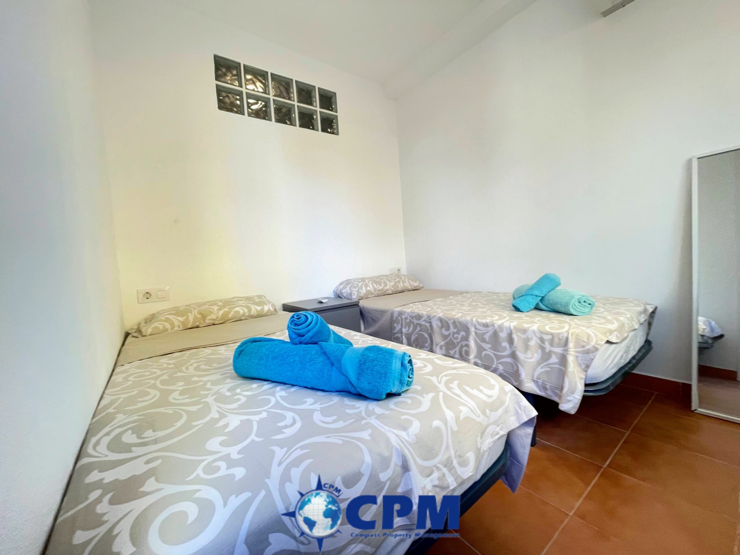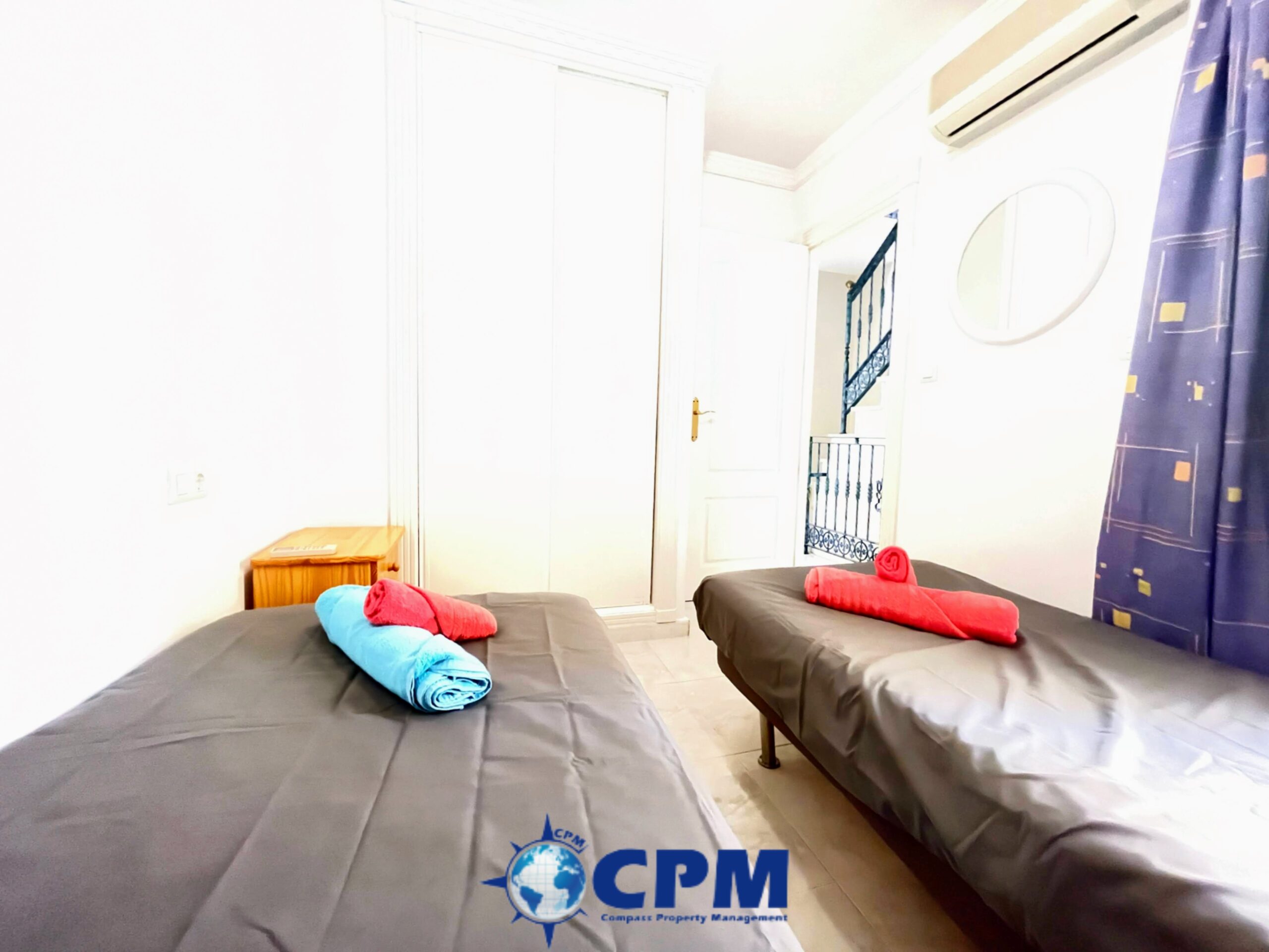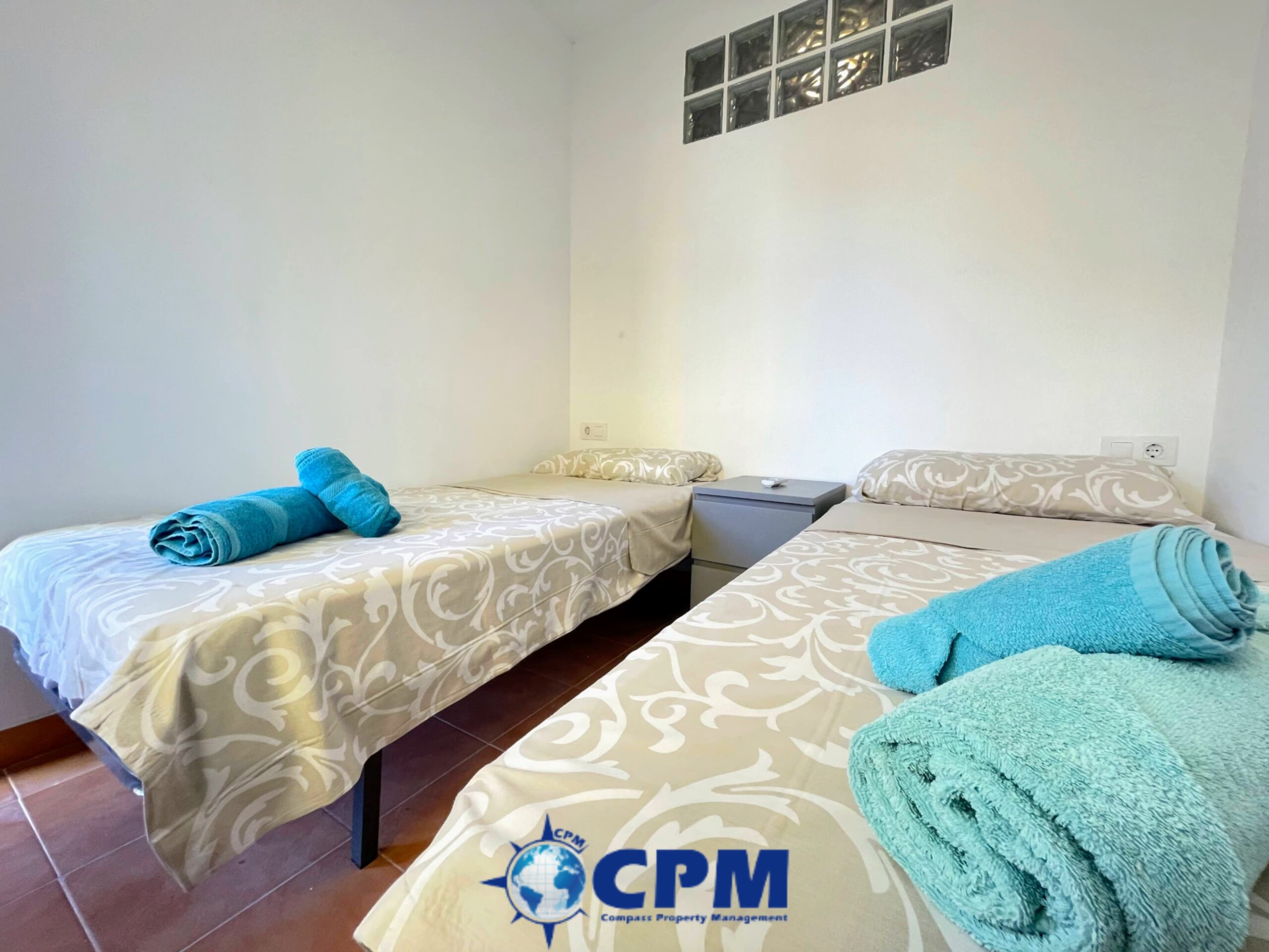 The lower level houses two bedrooms, ideal for family or guests, complemented by a family bathroom. The downstairs master bedroom features a double bed and built-in wardrobes, and both rooms benefit from air conditioning for comfort during the warmer months. The second bedroom is fitted with twin single beds, perfect for children or visitors. From the lower level, you can step out to a terrace that leads directly to the communal area, creating a seamless transition to outdoor living.