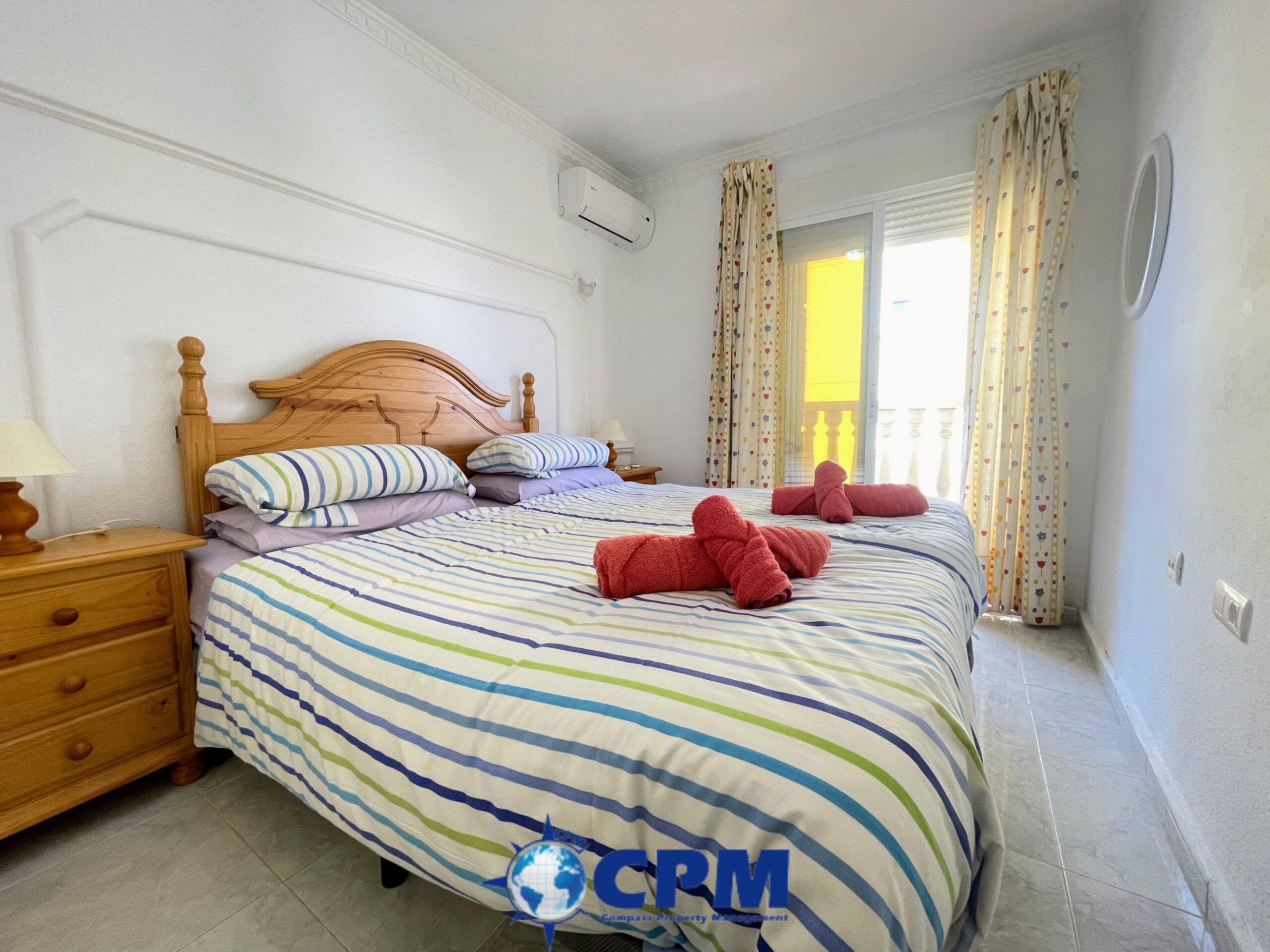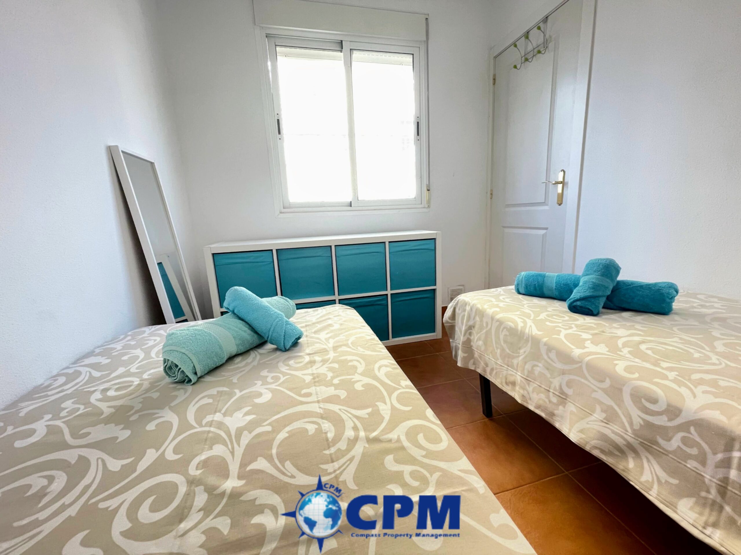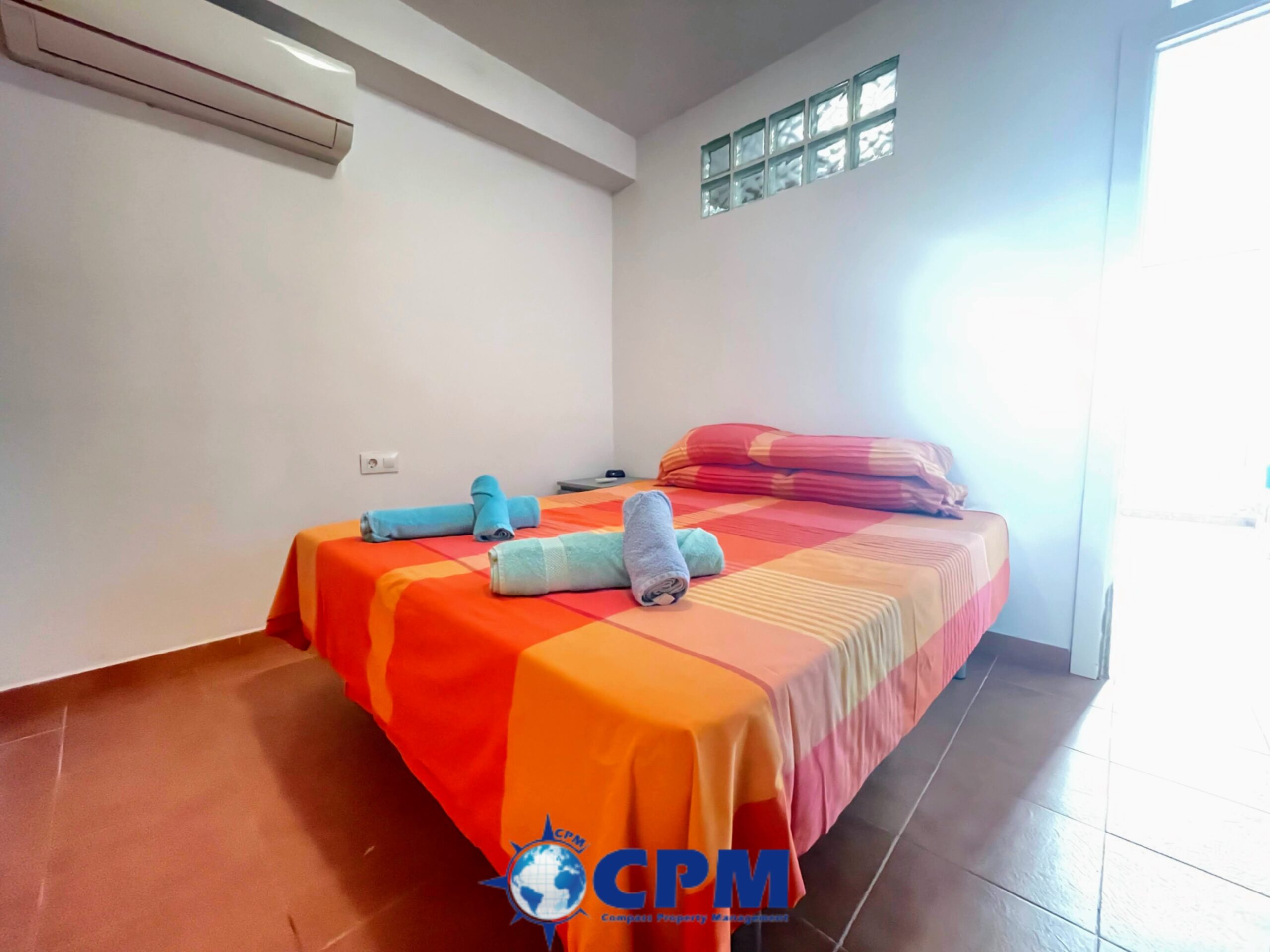 The lower level houses two bedrooms, ideal for family or guests, complemented by a family bathroom. The downstairs master bedroom features a double bed and built-in wardrobes, and both rooms benefit from air conditioning for comfort during the warmer months. The second bedroom is fitted with twin single beds, perfect for children or visitors. From the lower level, you can step out to a terrace that leads directly to the communal area, creating a seamless transition to outdoor living.