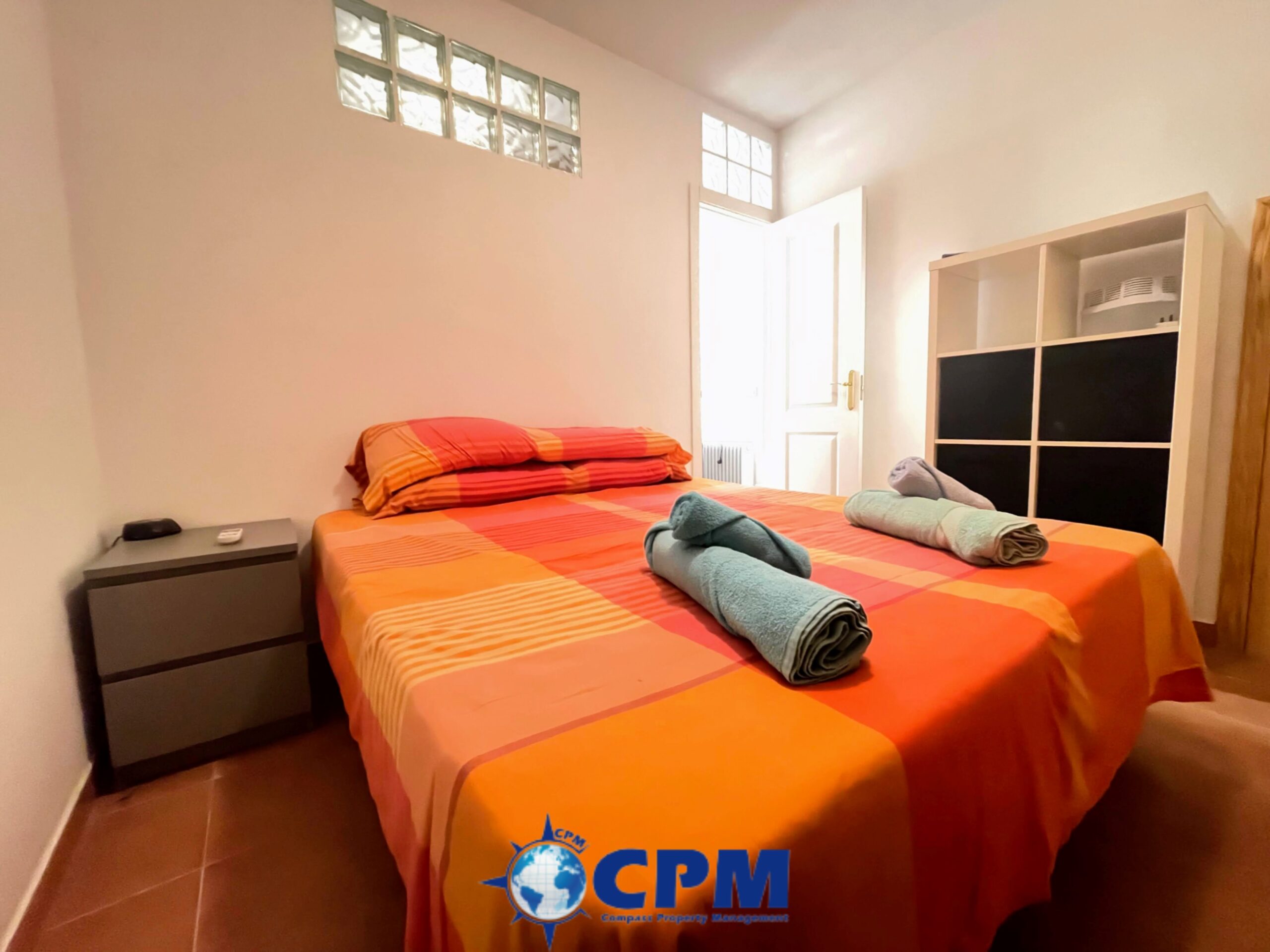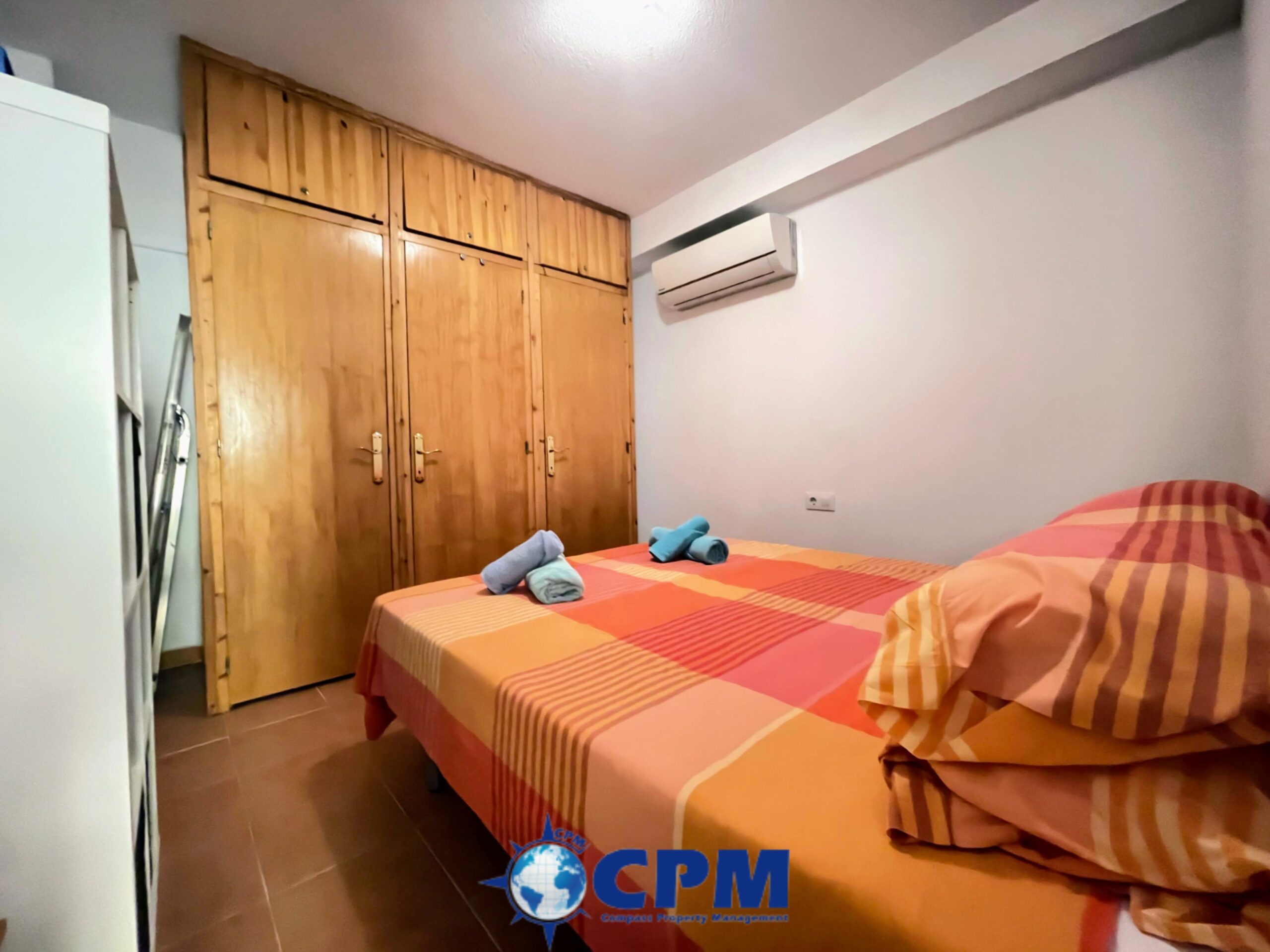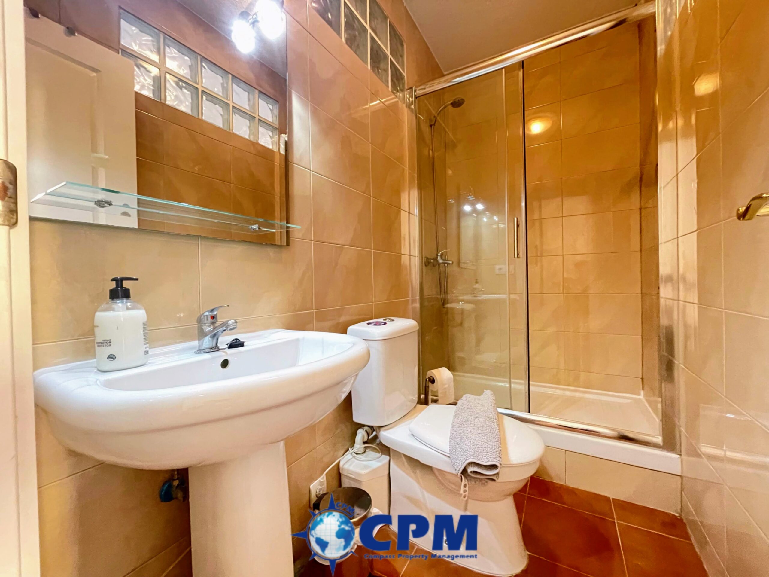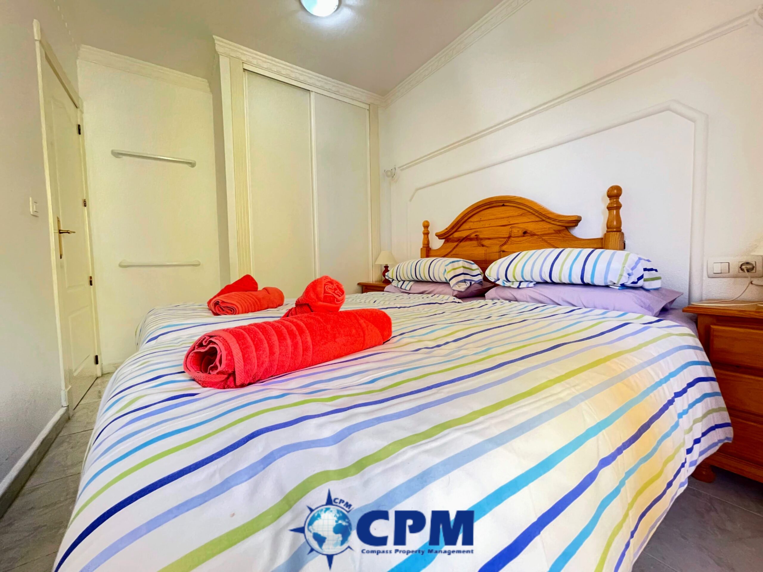 The lower level houses two bedrooms, ideal for family or guests, complemented by a family bathroom. The downstairs master bedroom features a double bed and built-in wardrobes, and both rooms benefit from air conditioning for comfort during the warmer months. The second bedroom is fitted with twin single beds, perfect for children or visitors. From the lower level, you can step out to a terrace that leads directly to the communal area, creating a seamless transition to outdoor living.