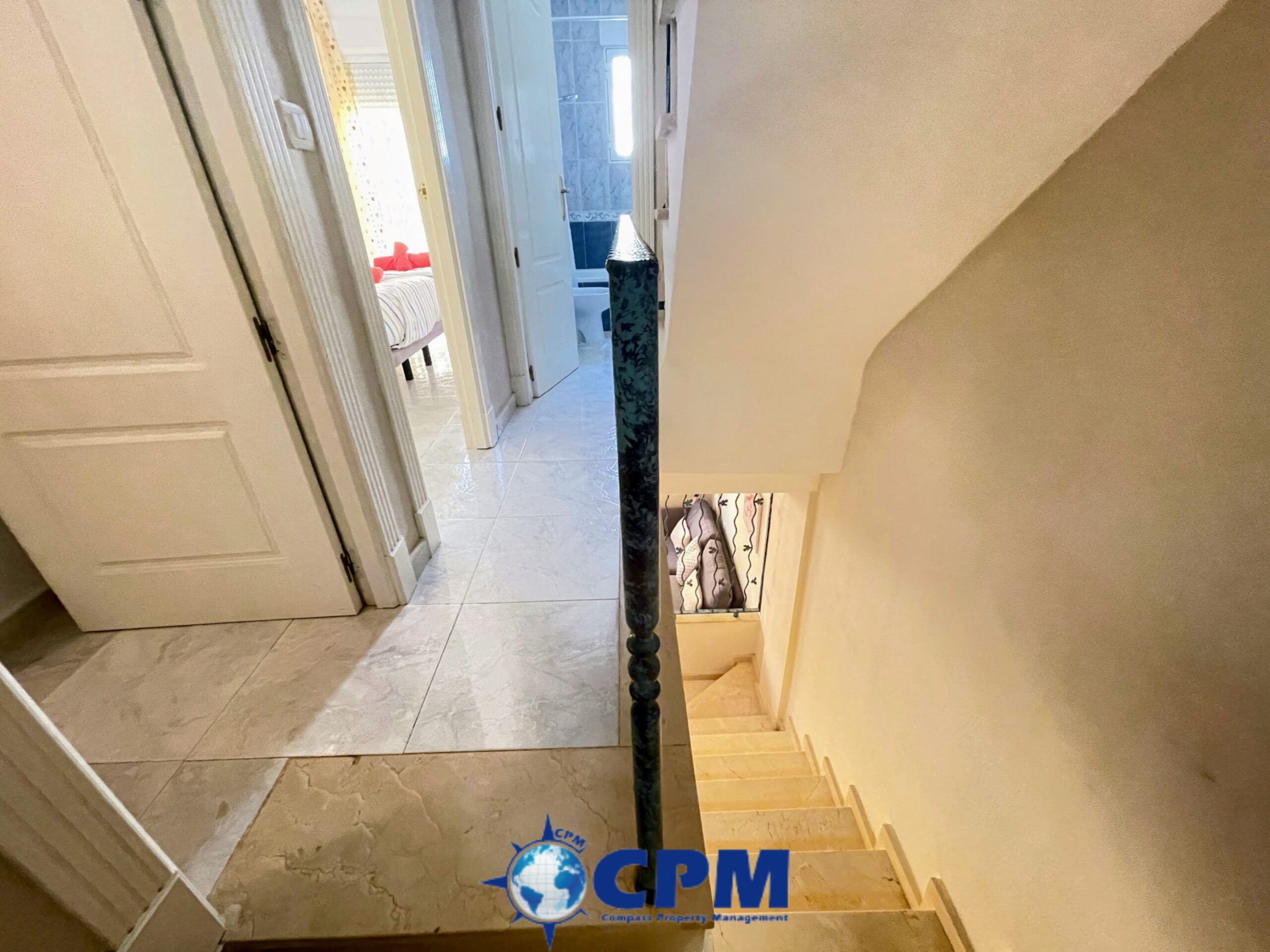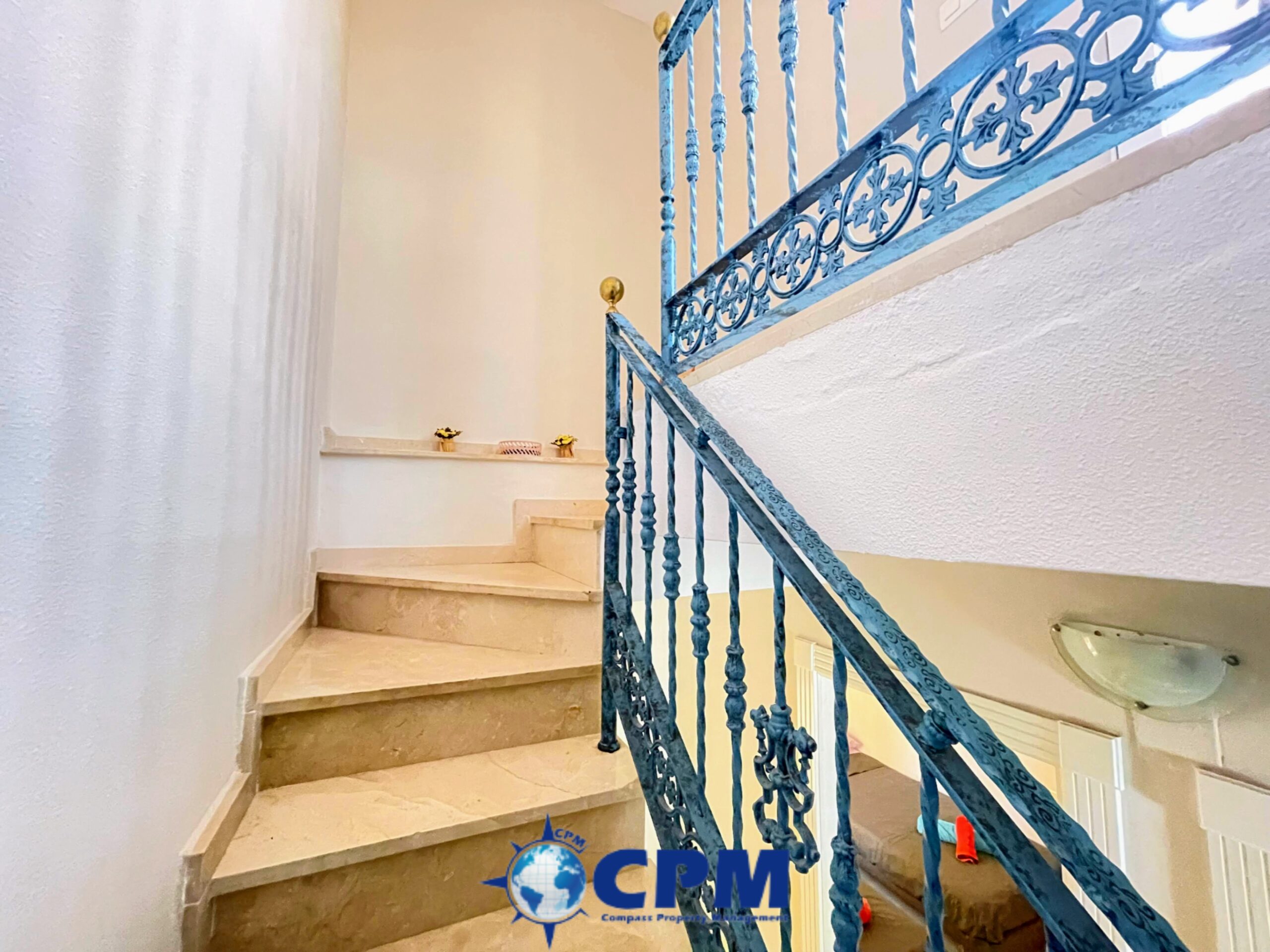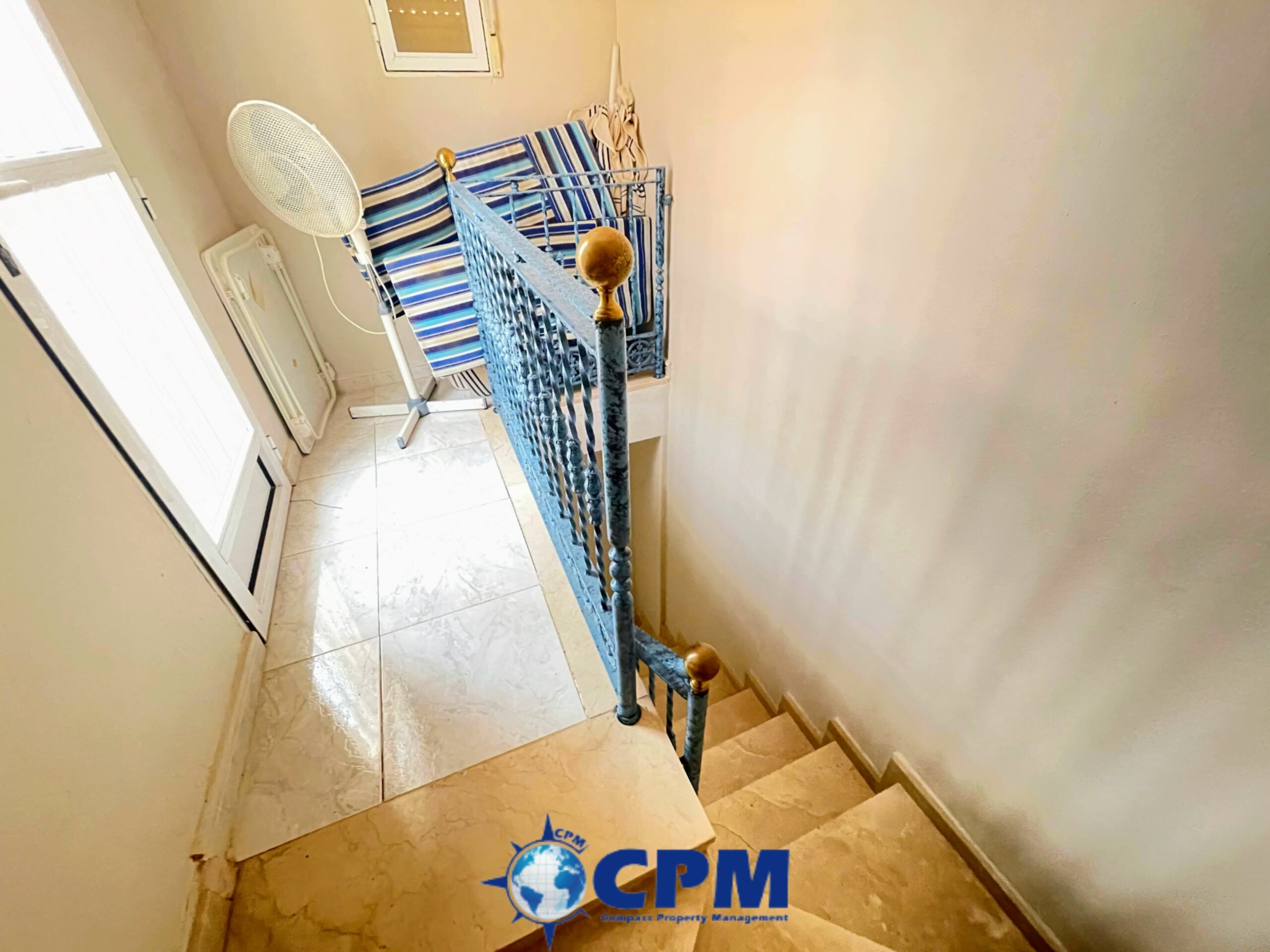 Ascend to the upper level where you’ll find two additional bedrooms, both equipped with air conditioning. At the top of the stairs, the first bedroom features twin single beds and a built-in wardrobe. The master bedroom on this floor consists of twin beds. The upper level also boasts a family bathroom with a bath, toilet, and bidet. Access to the spacious solarium is also available from this level, offering a perfect spot for sunbathing or entertaining under the sky.