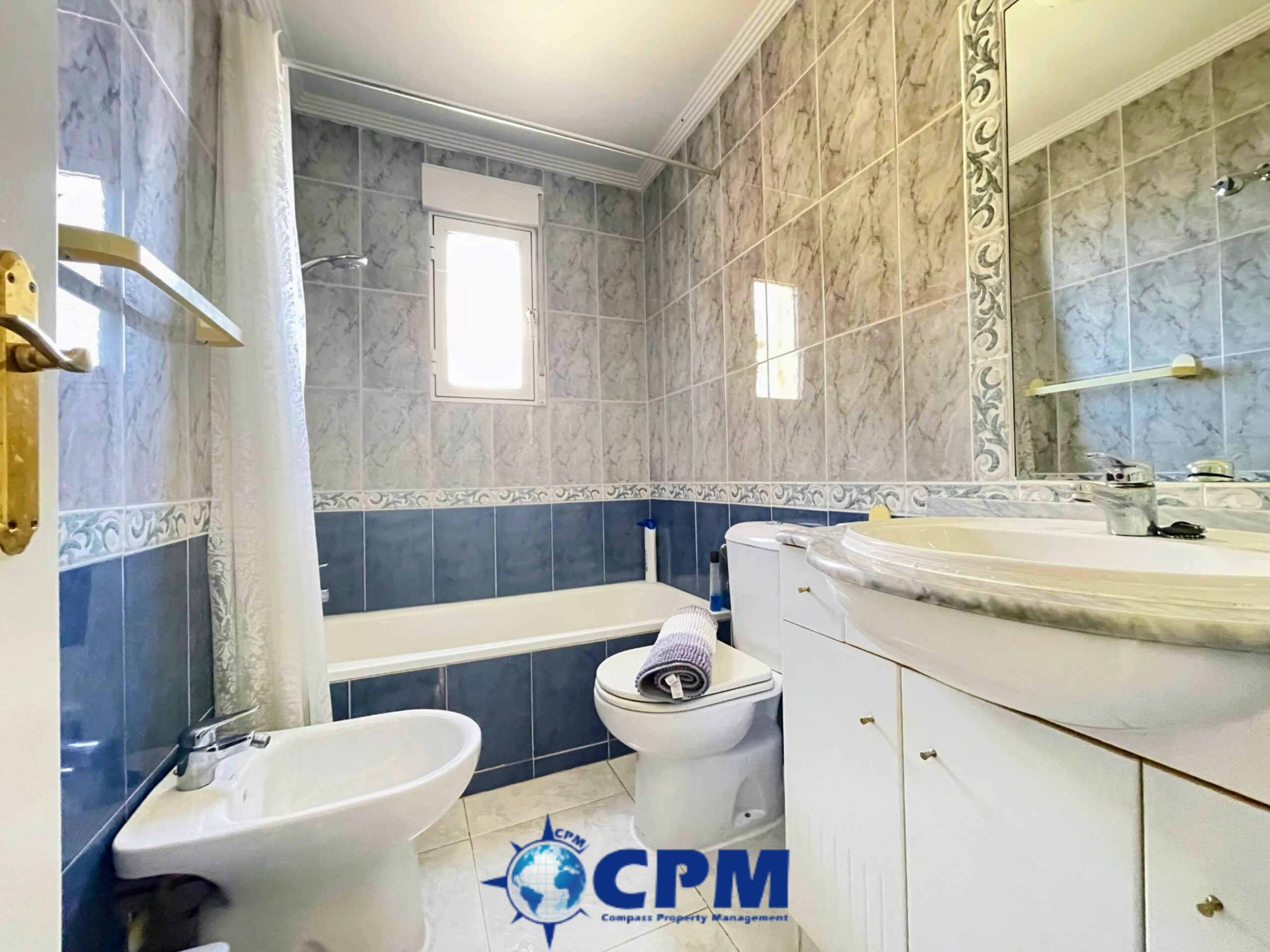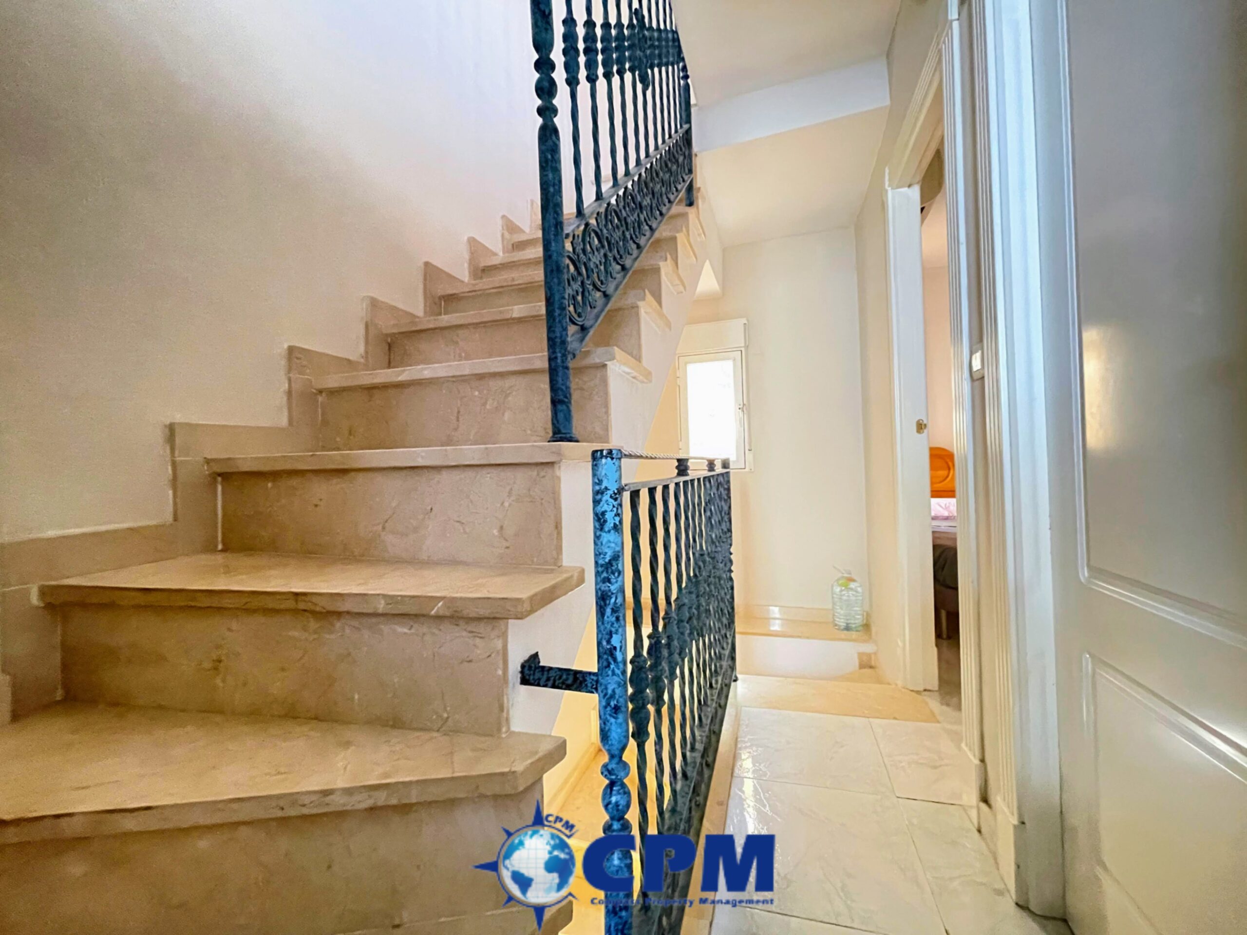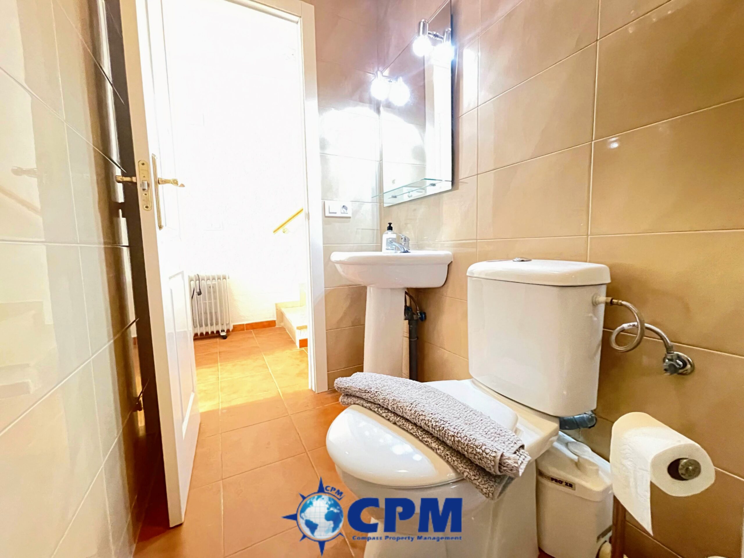 Ascend to the upper level where you’ll find two additional bedrooms, both equipped with air conditioning. At the top of the stairs, the first bedroom features twin single beds and a built-in wardrobe. The master bedroom on this floor consists of twin beds. The upper level also boasts a family bathroom with a bath, toilet, and bidet. Access to the spacious solarium is also available from this level, offering a perfect spot for sunbathing or entertaining under the sky.